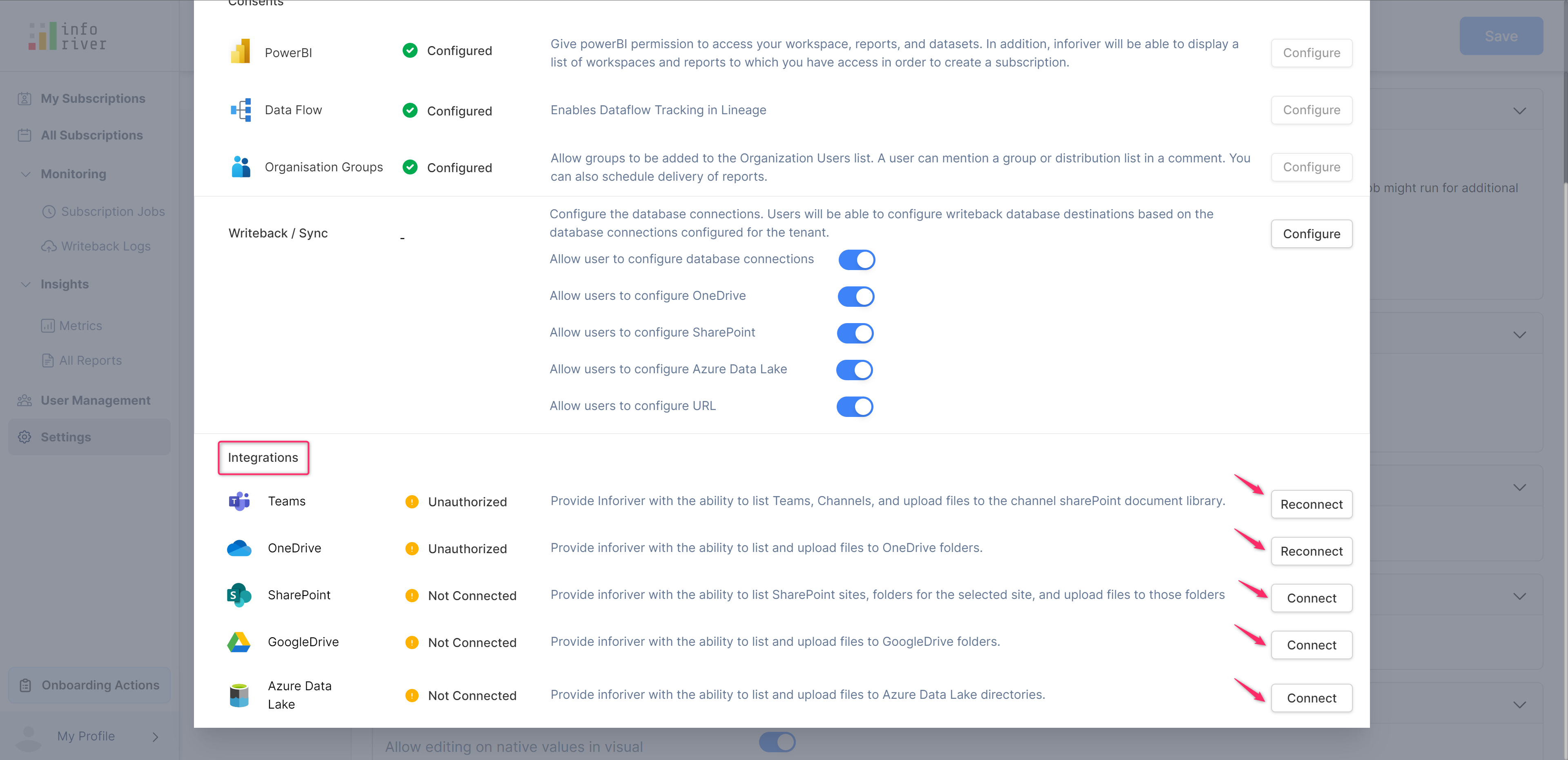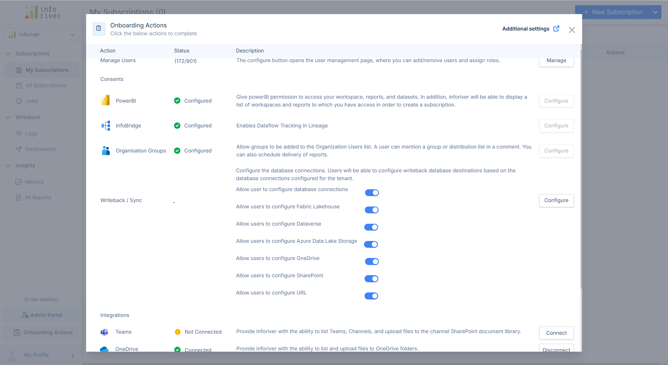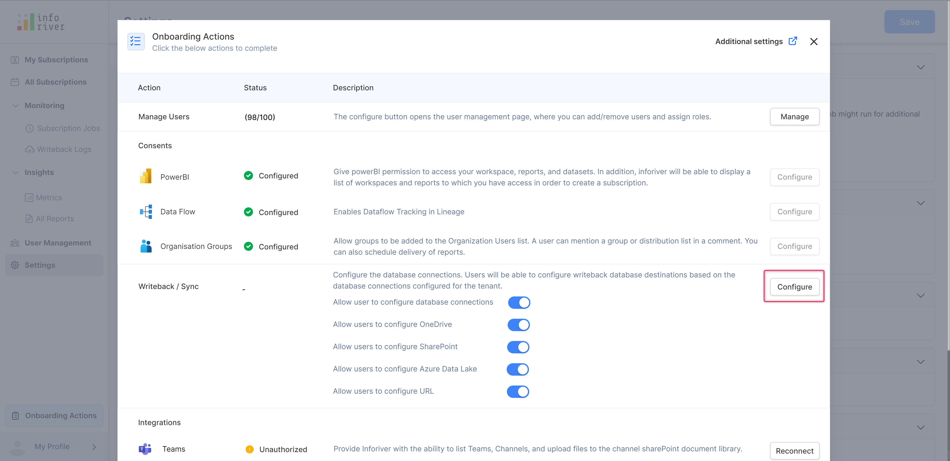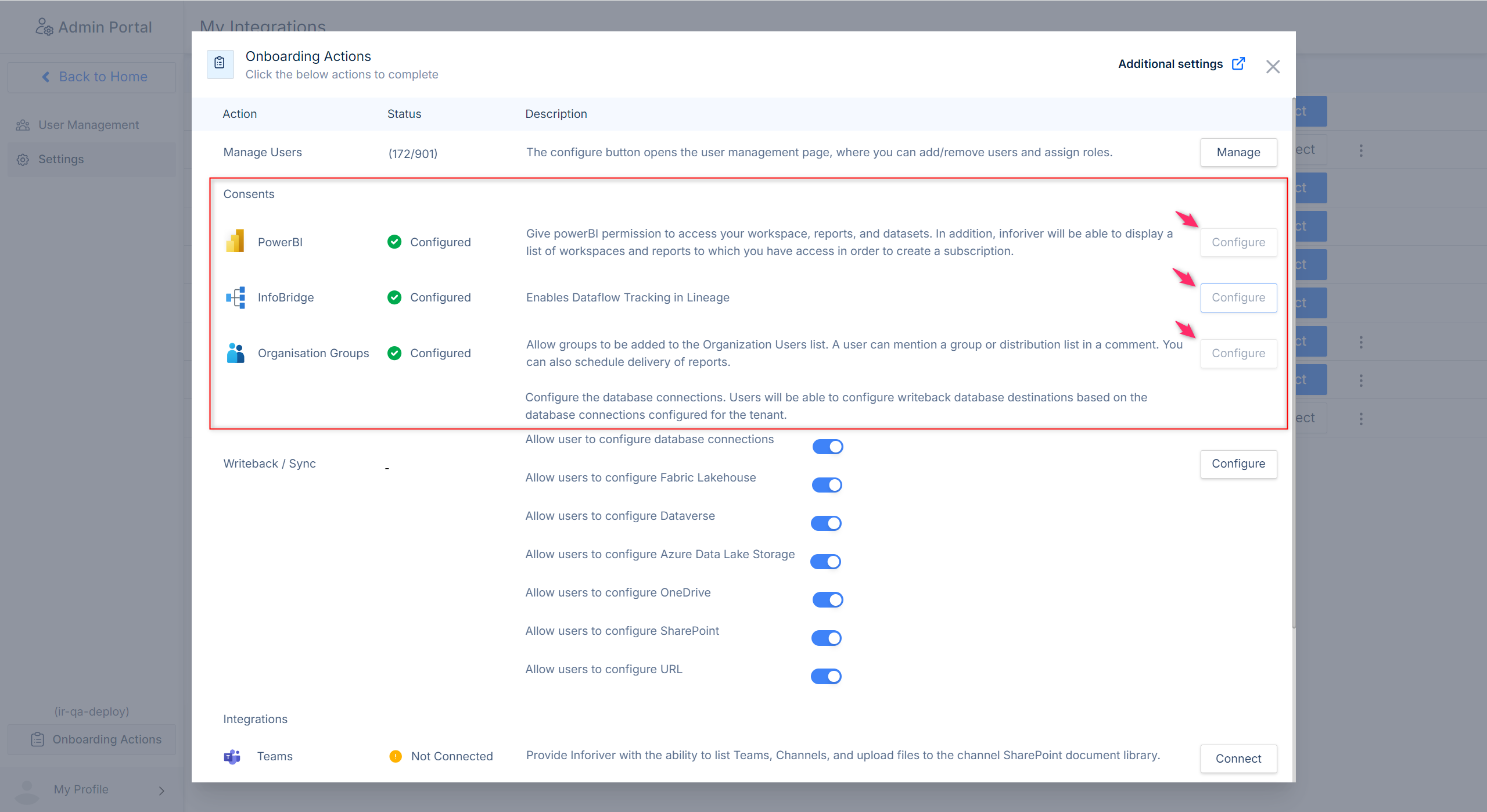 Power BI permissions, data flow tracking between InfoBridge and Inforiver, and organization group configurations are all managed with consent under this section. Clicking **Configure** will take you to the appropriate settings page and enable the permissions.