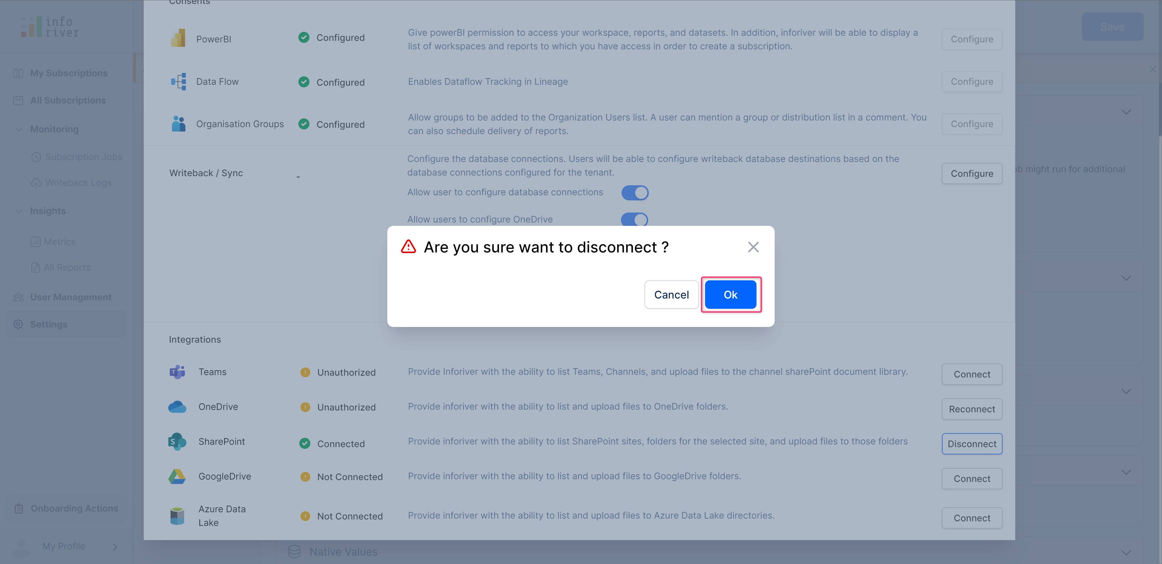 <figure><img src="https://3062809325-files.gitbook.io/~/files/v0/b/gitbook-x-prod.appspot.com/o/spaces%2FEbkCXCUXmtUq5tcnUtZE%2Fuploads%2Fa6OxElkdau3NekkcChMx%2Fdisconnect-confirmation.png?alt=media&#x26;token=24fc8457-d47b-4d1e-bb51-caf930e1e4c8" alt=""><figcaption><p>Disconnect integrations modal</p></figcaption></figure>