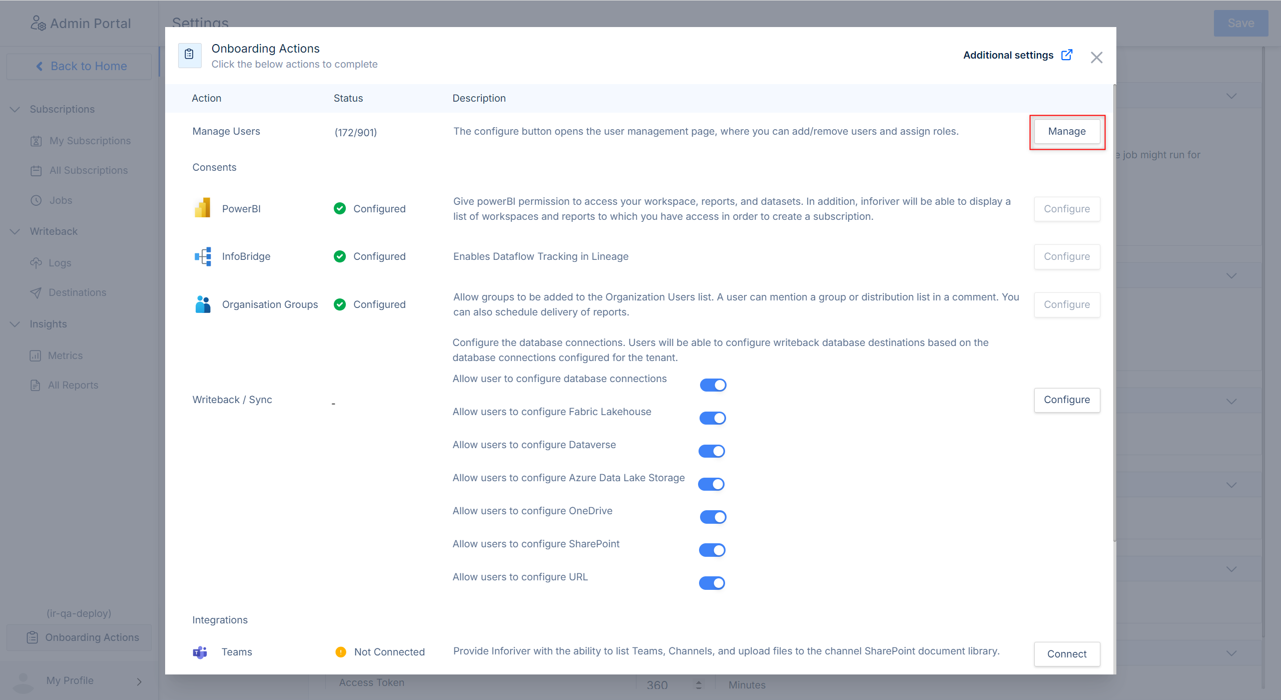 This option is for user management configuration where you can add/remove users and assign user roles. Clicking on **Manage** will navigate you to the [user management](https://docs.inforiver.com/admin-console/user-management) page.
