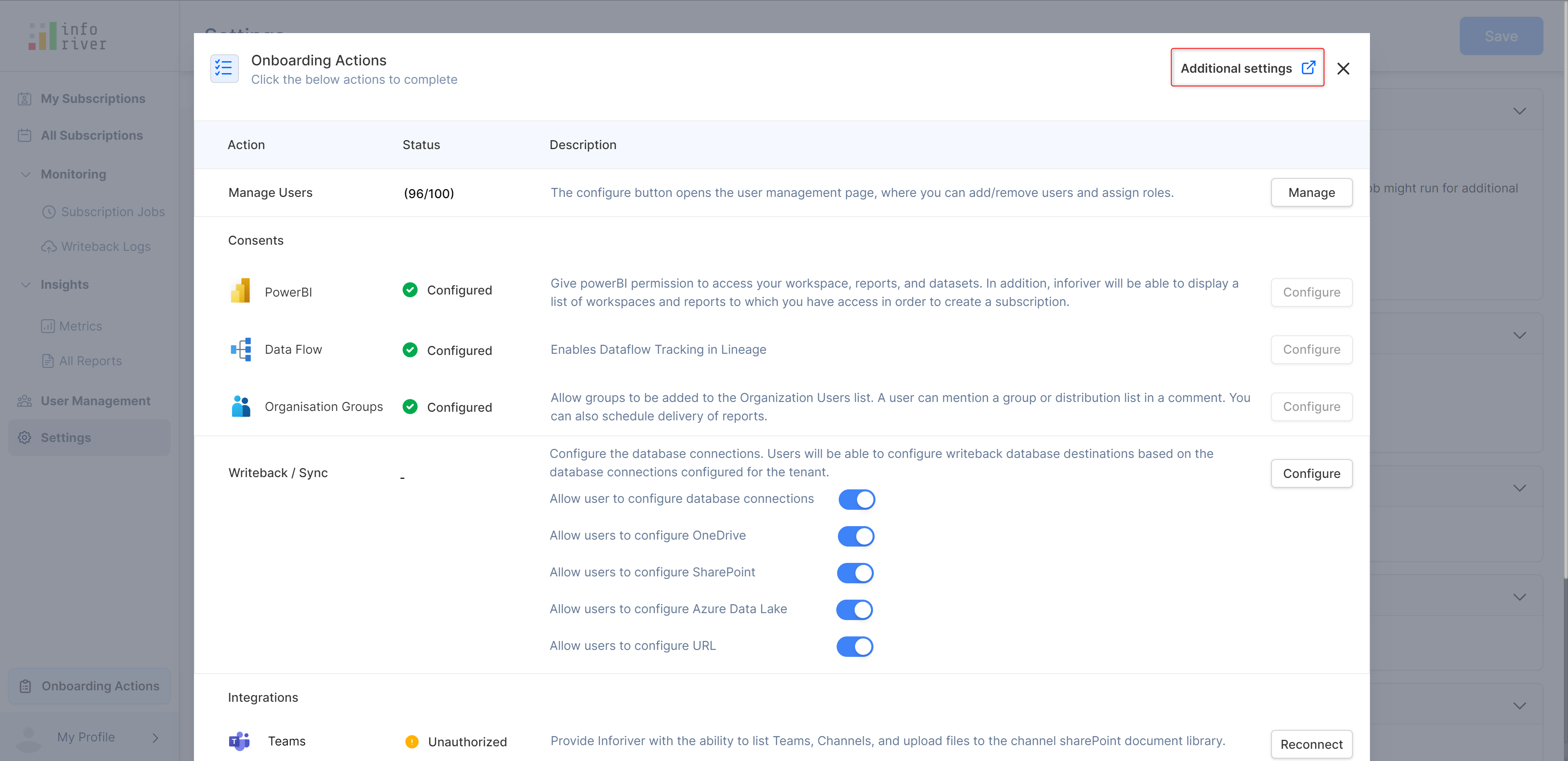 Click on **Additional settings** to navigate to the settings page. These additional settings are explained in [this section](https://docs.inforiver.com/admin-console/settings).
