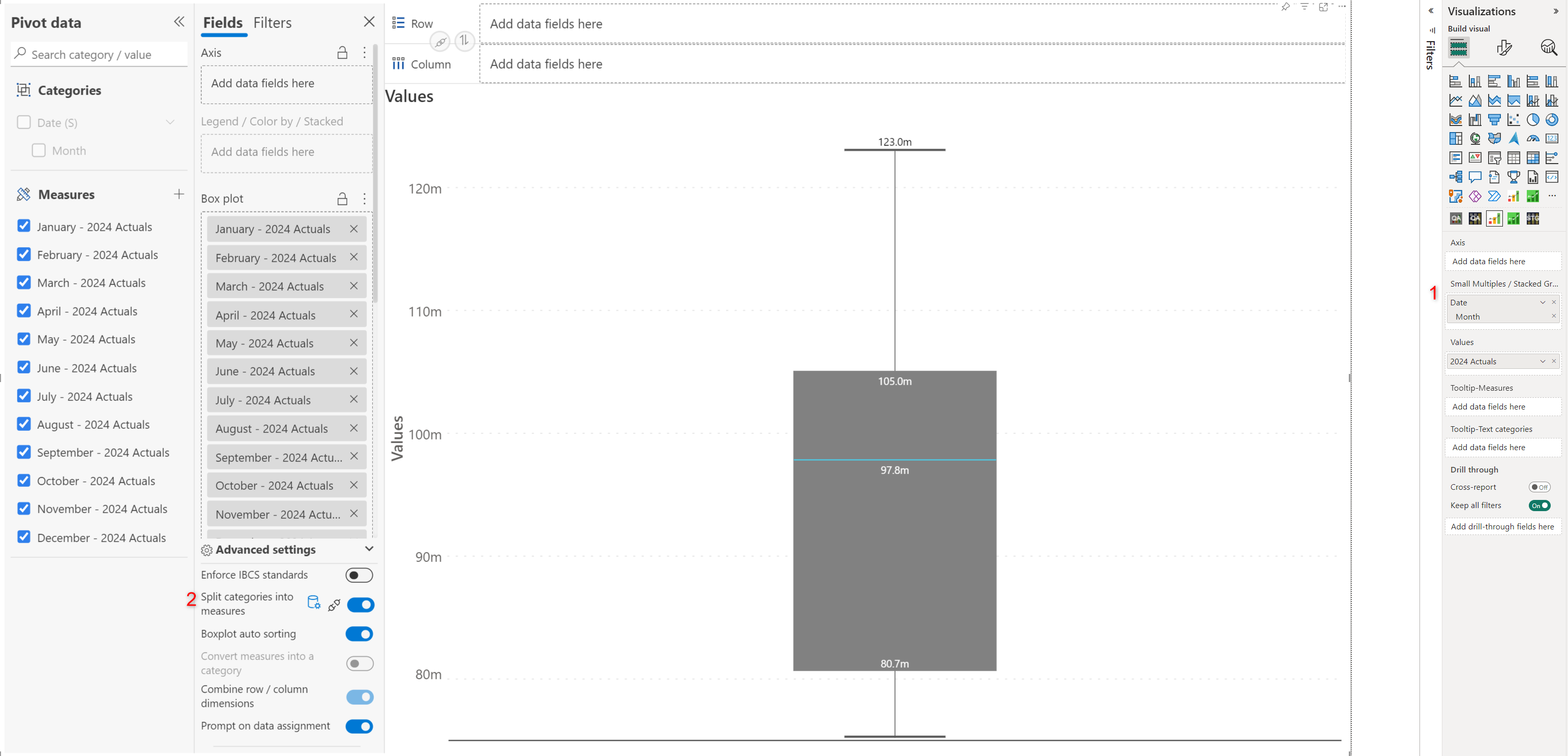 | **Values parameter** | Drag multiple measures to compare (e.g., Upper Quartile, Upper Quartile PY, Lower Quartile, Lower Quartile PY, Median, Whisker Max, Whisker Min). |