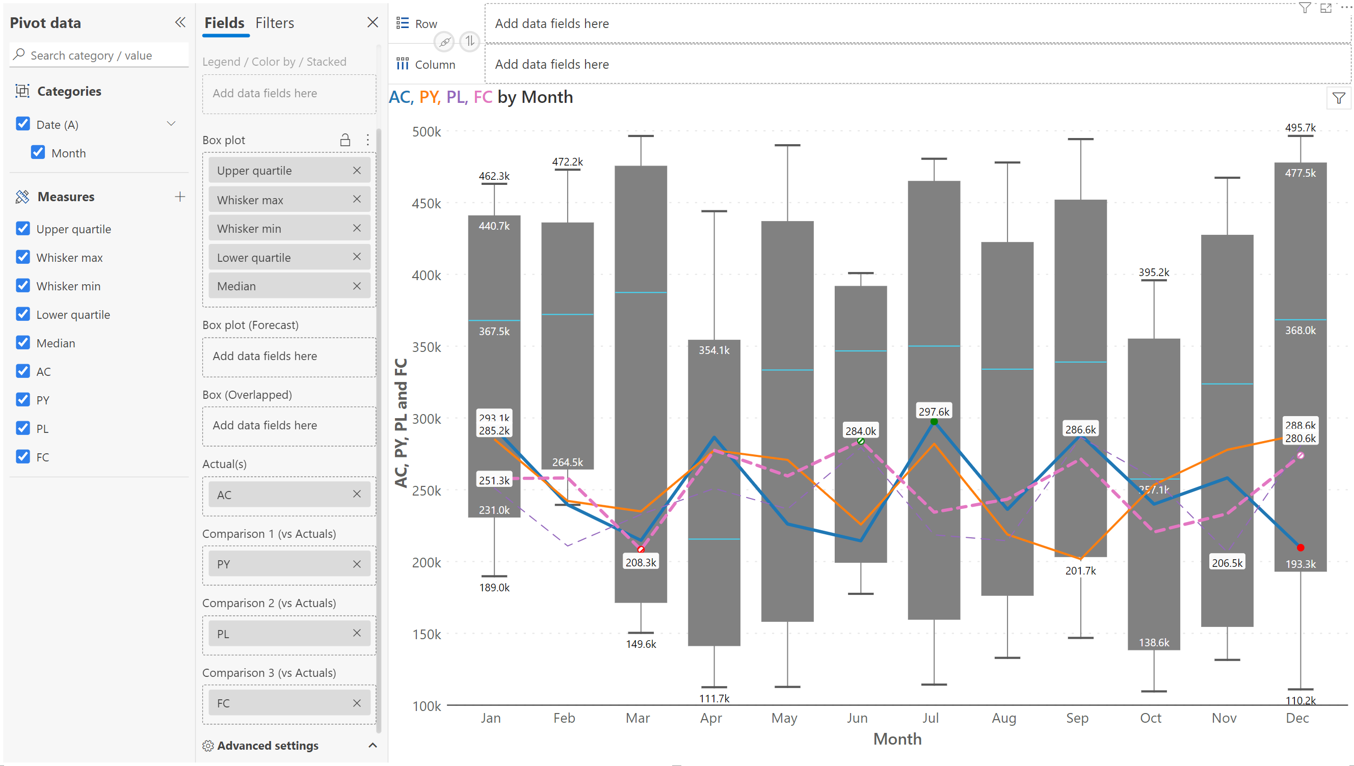 | **Values parameter** | Drag multiple measures to compare (e.g., Upper Quartile, Lower Quartile, Median, Whisker Max, Whisker Min, AC, PY, PL, FC). |