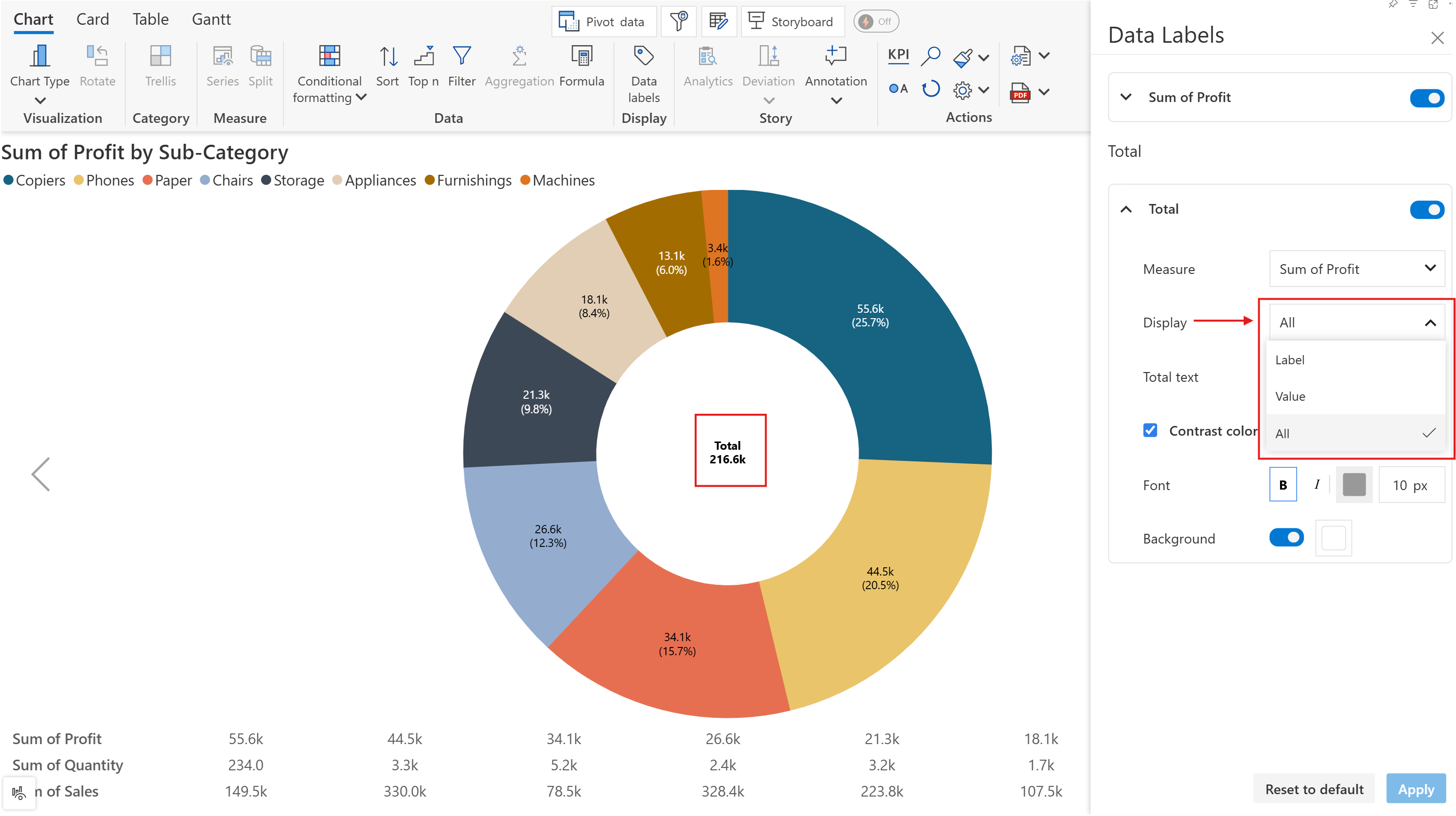 Choose to display the label, in this case, 'Total', and the value, or both.&#x20;