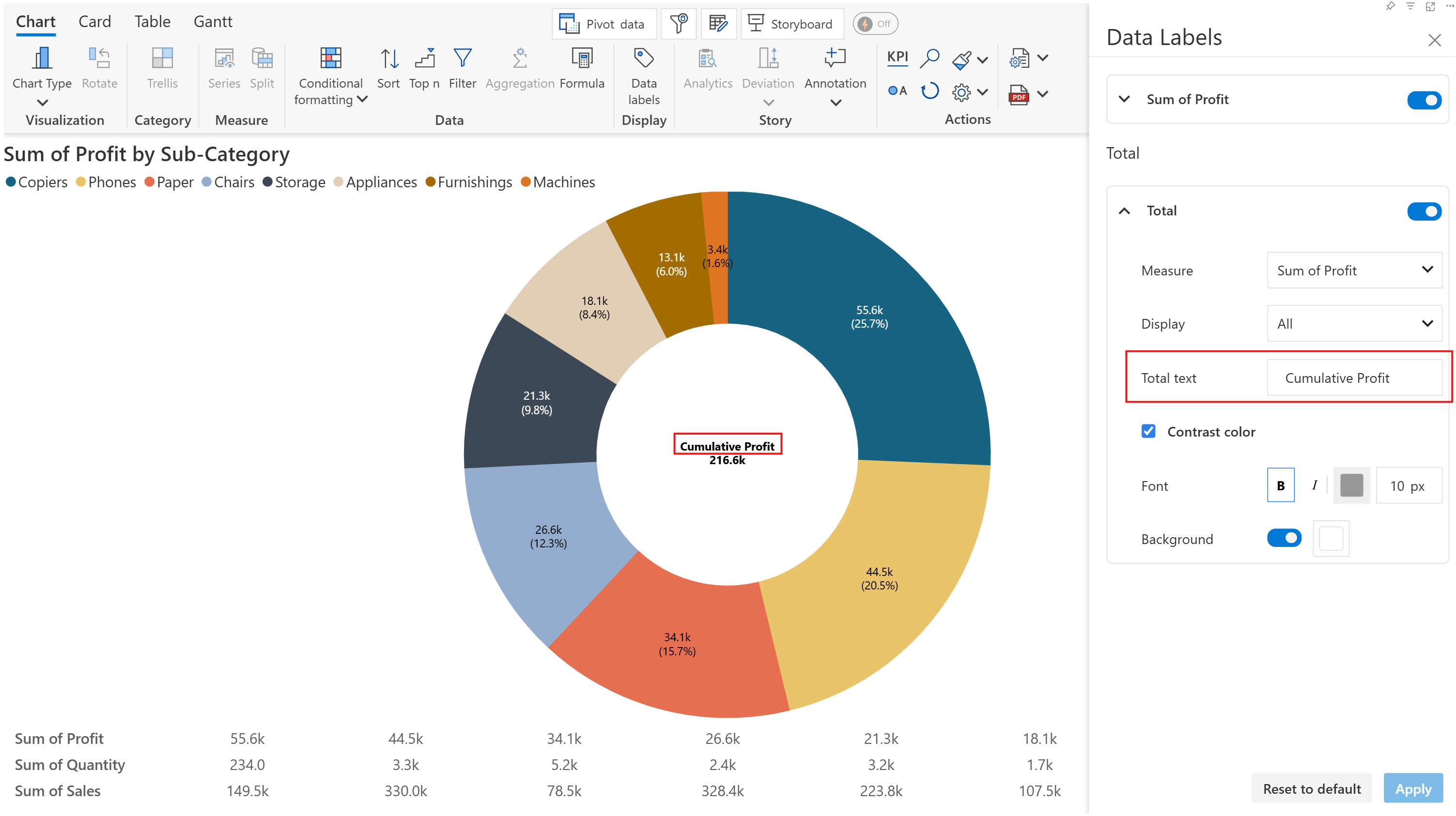 Customize the text displayed with the total value - in this example, we've changed the default 'Total' to 'Cumulative Profit'.