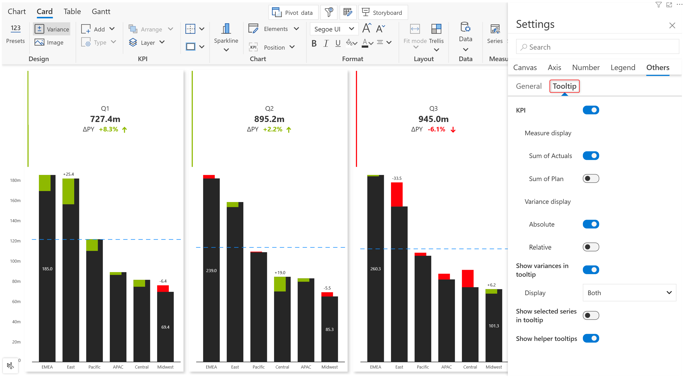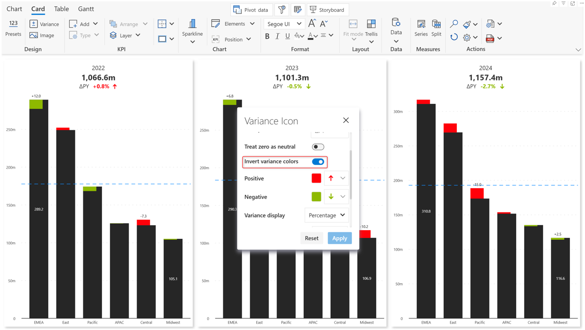Enable the toggle to interchange variance colors. In this report, red represents positive variance, and green represents negative variance.