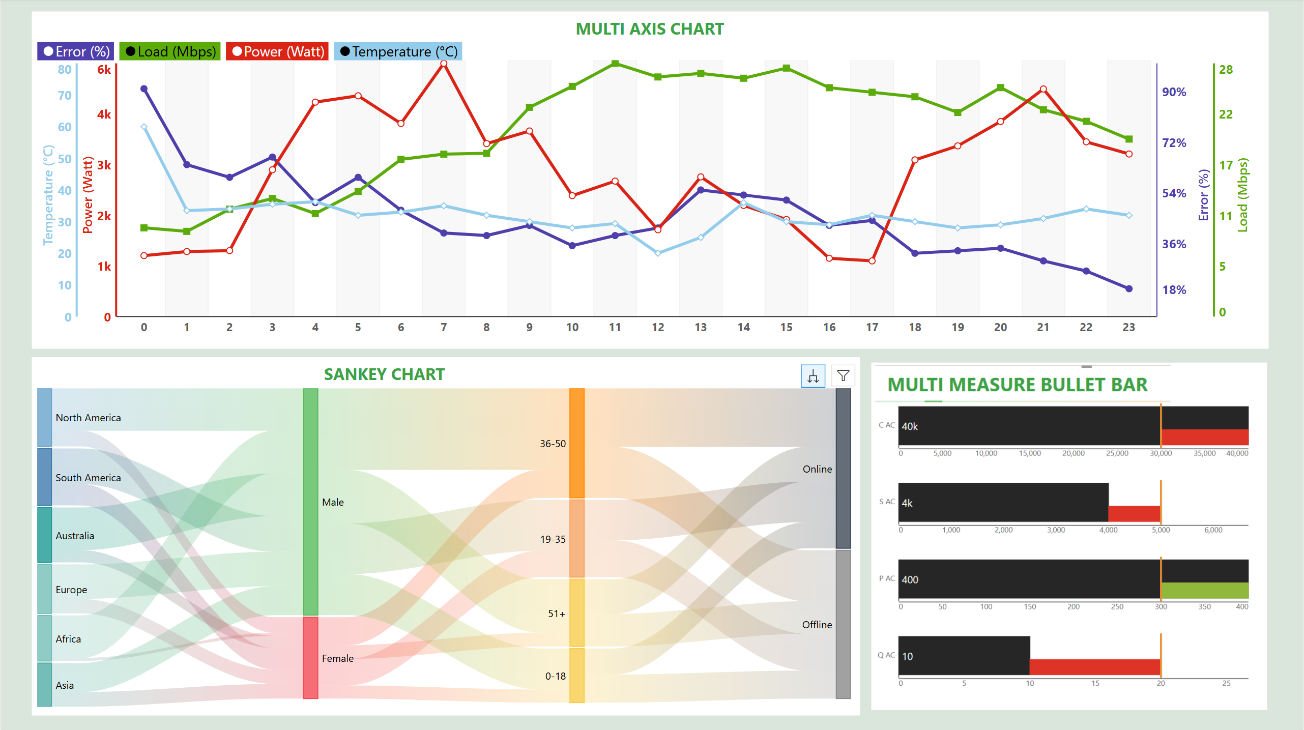 Multi-measure bullet chart: Ideal for side-by-side visualization of multiple measures with different scaling factors. You can track the actuals against the target simultaneously for all the measures.