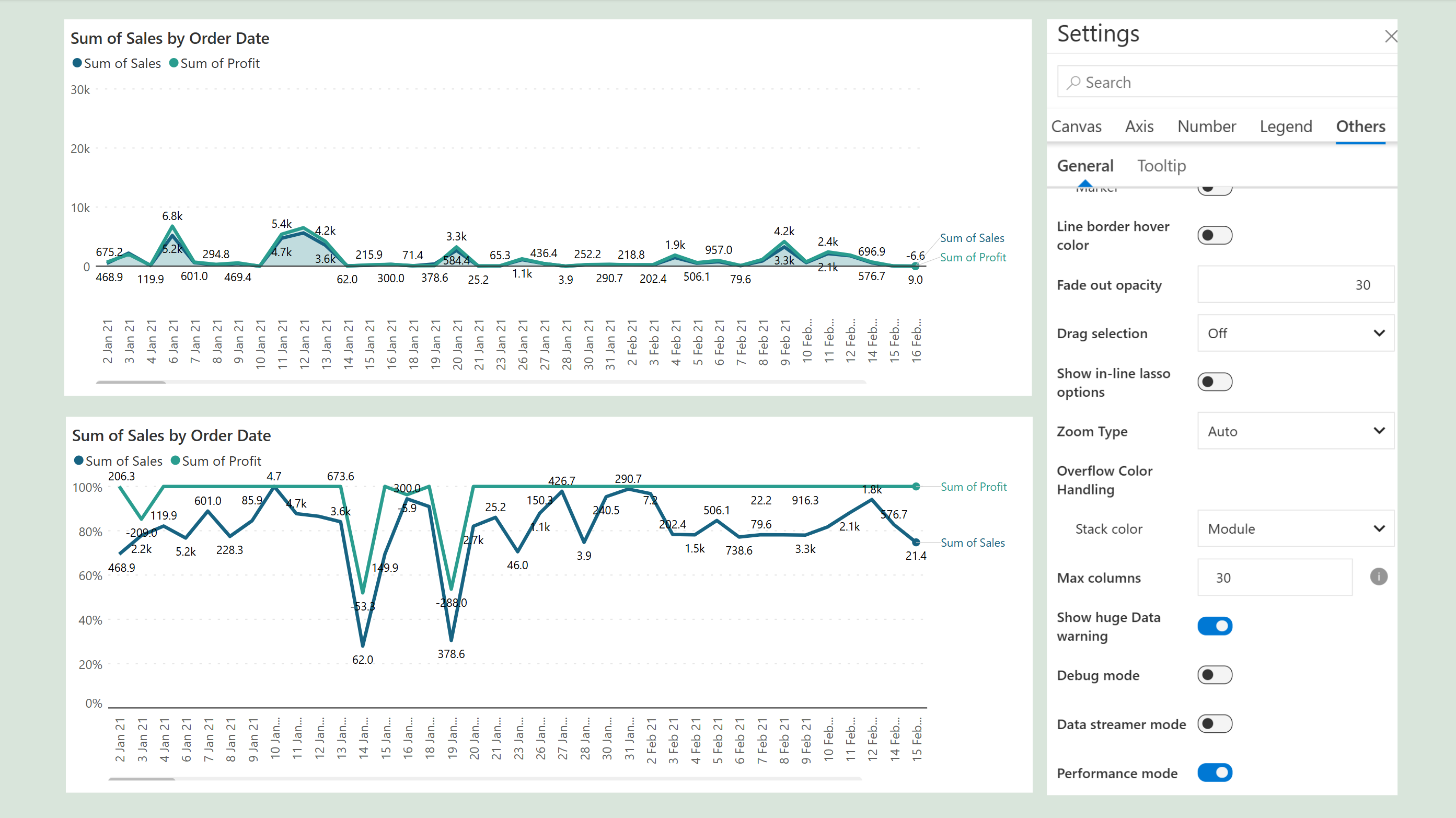 Performance mode- Line and area charts with high data volume and a large number of data points can be plotted significantly faster with the performance mode option. Enable the toggle from Other settings for faster rendering.