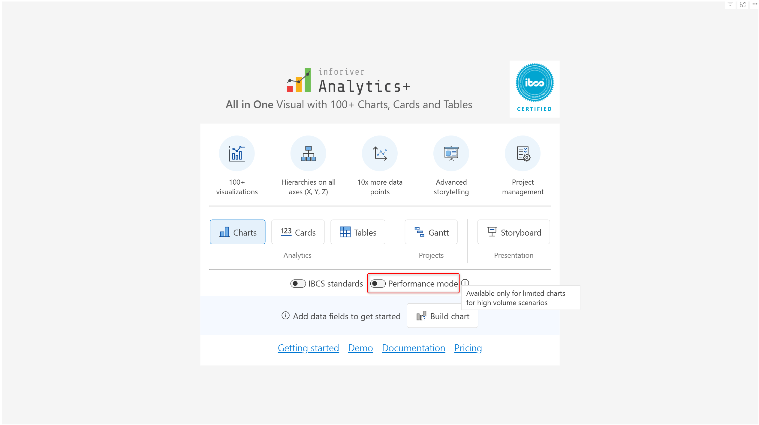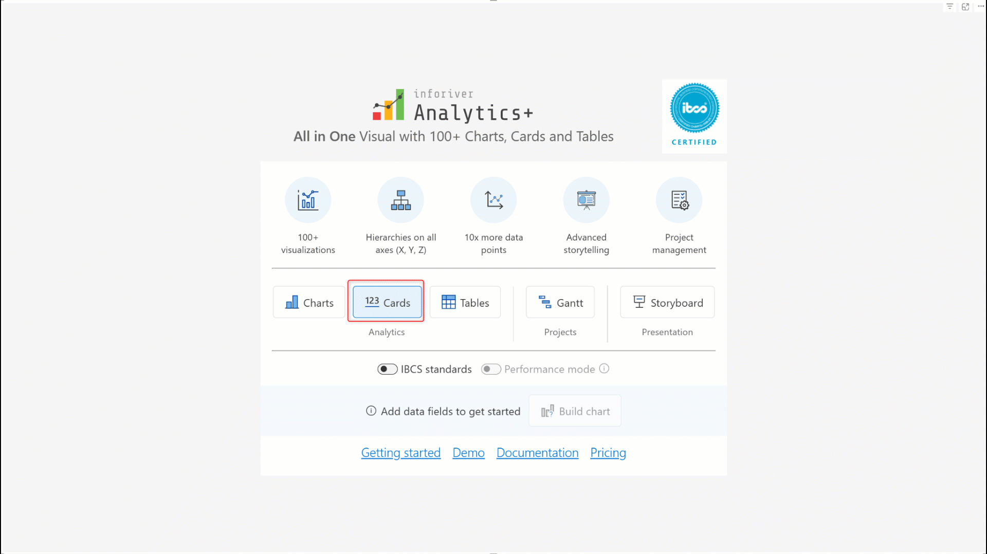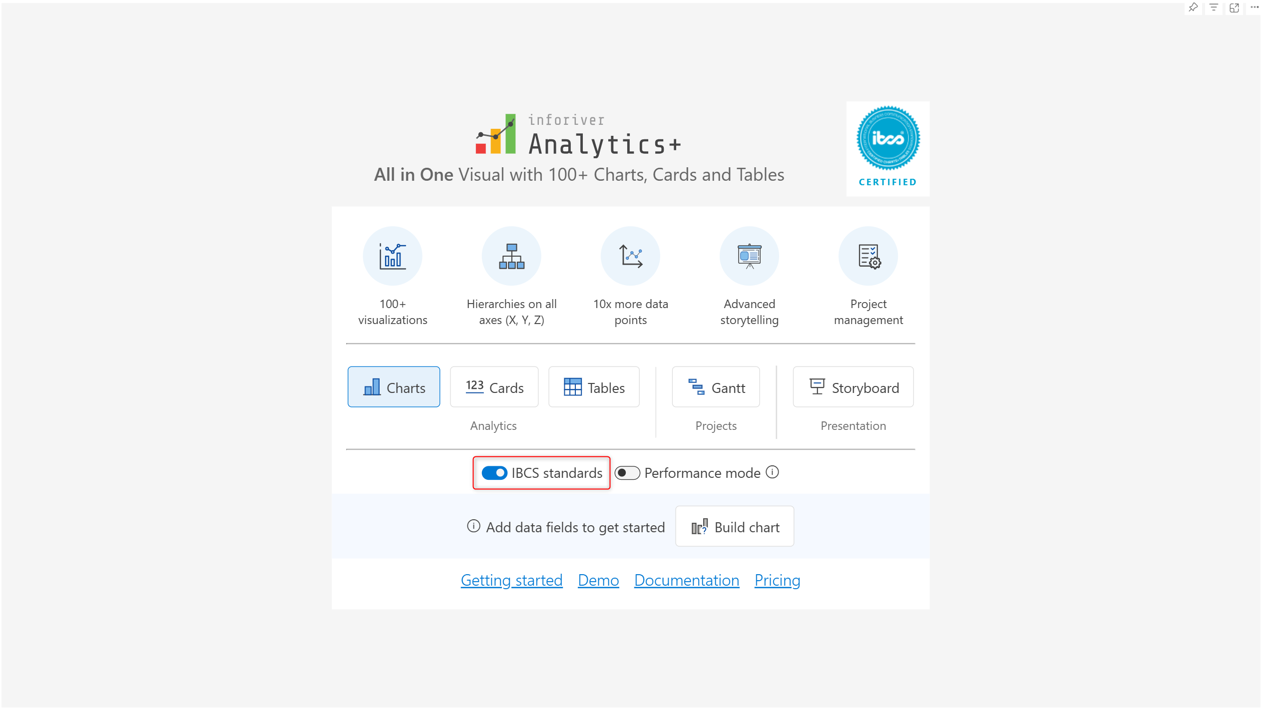 Analytics+ is an IBCS-certified visual. Enable the **IBCS standards** toggle to create charts, KPI cards, and tables that are fully IBCS compliant.