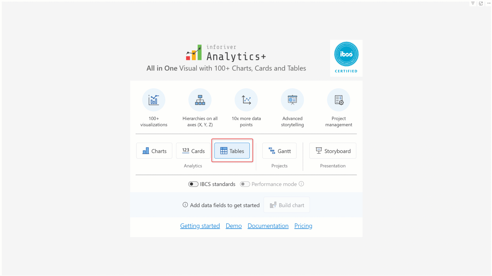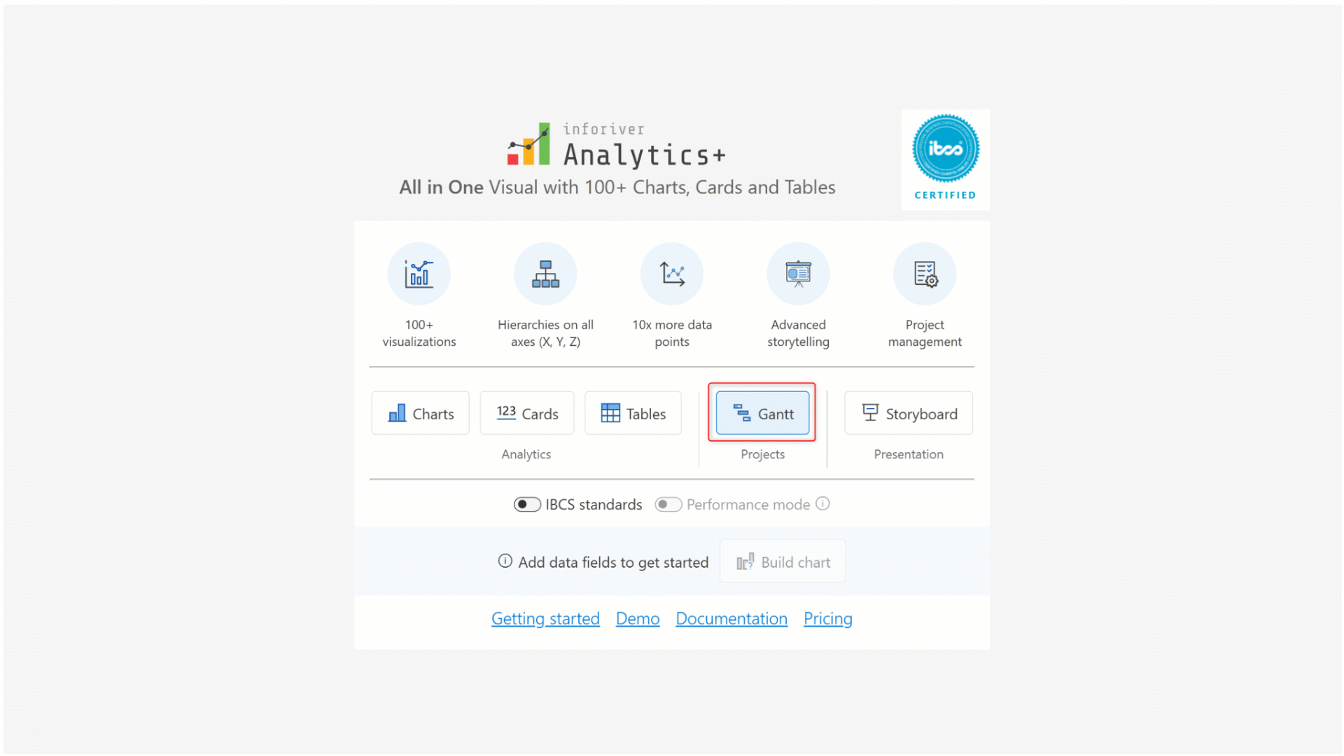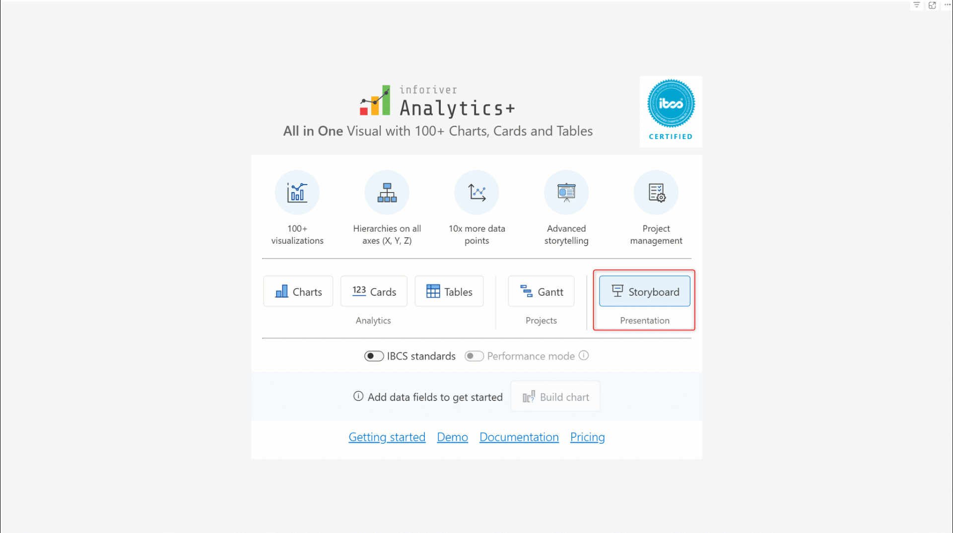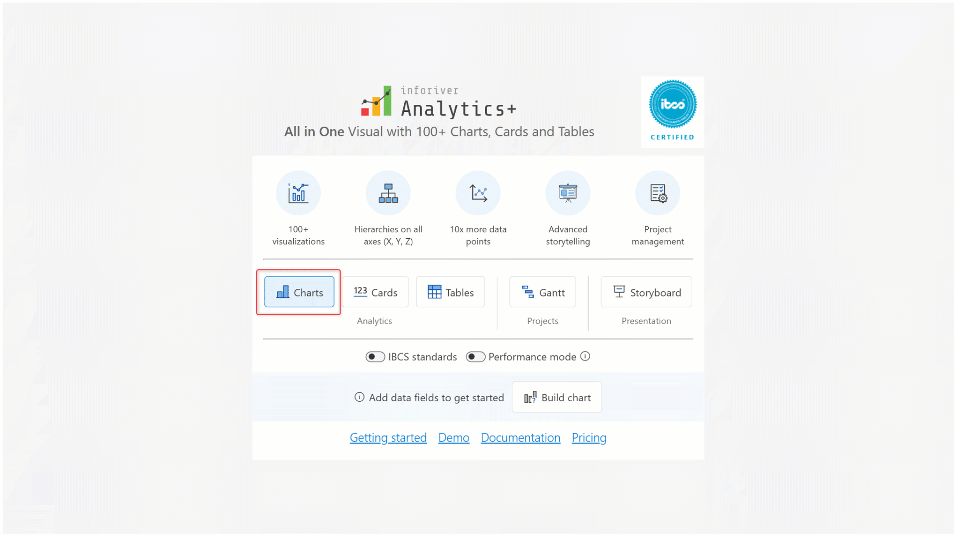 Analytics+ is an IBCS-certified visual. Enable the **IBCS standards** toggle to create charts, KPI cards, and tables that are fully IBCS compliant.