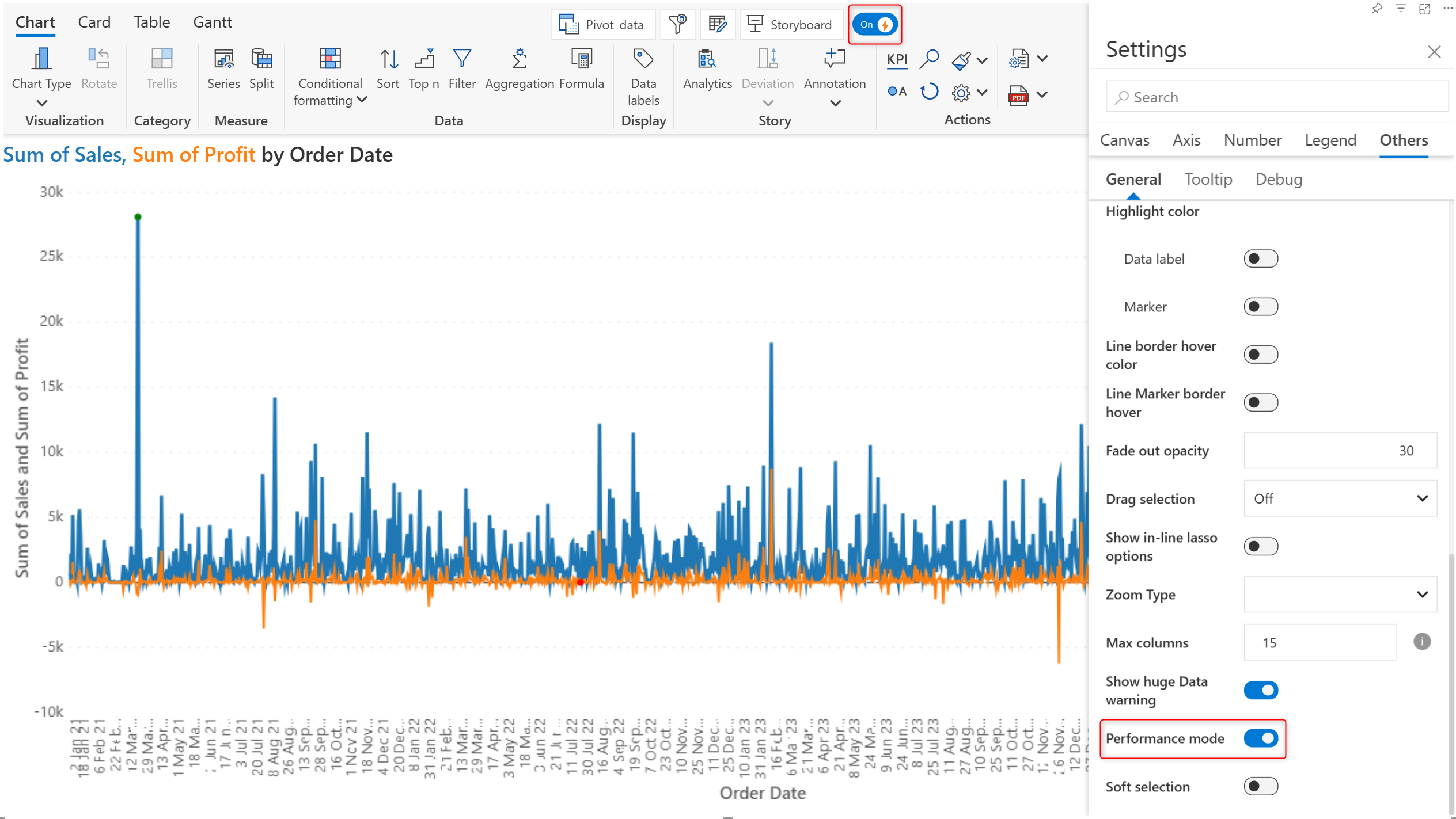 Line and area charts with high data volume and a large number of data points can be plotted significantly faster with the performance mode option.