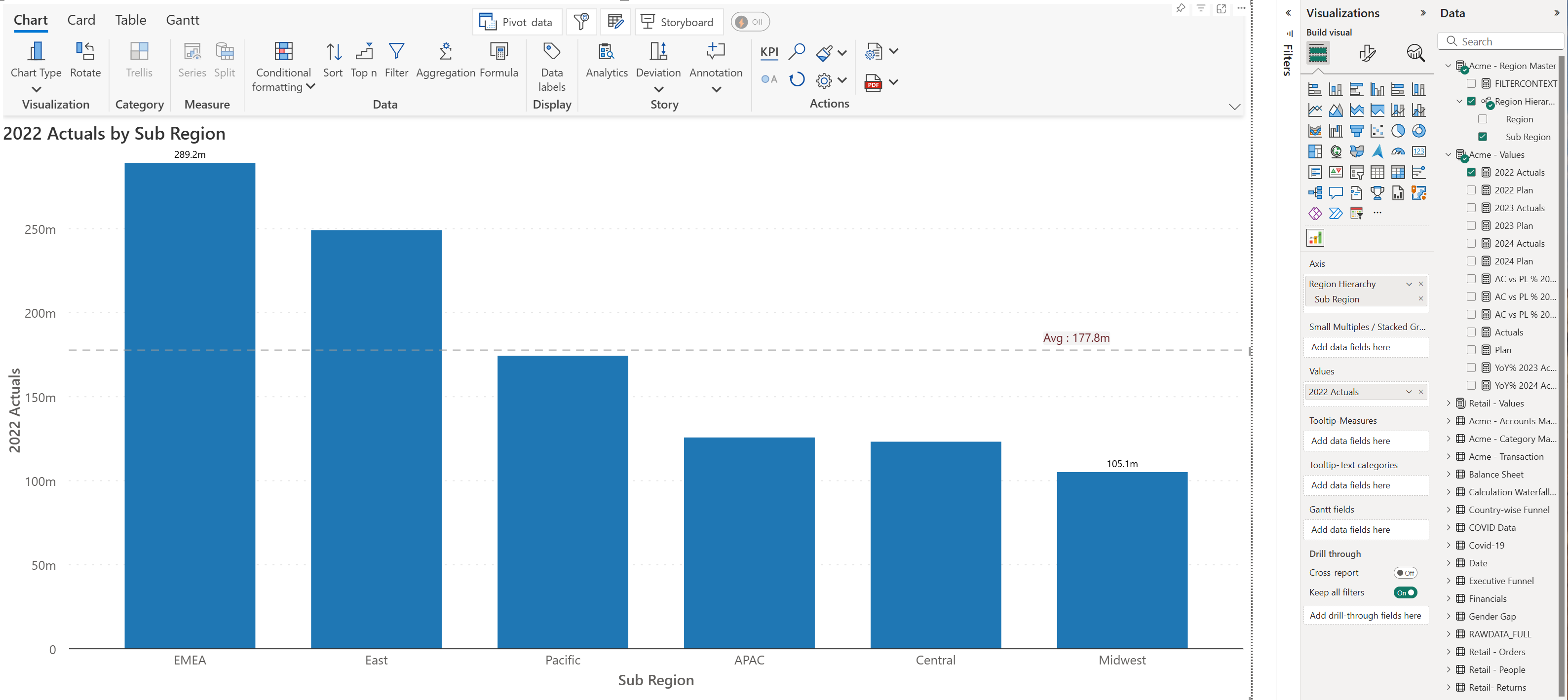 The Analytics+ visual ships with 3 different modes, each with a dedicated toolbar that contains customization options specific to a particular mode. You can seamlessly switch between the three modes by navigating to the respective ribbon. Click on each of the tabs below to preview the modes.