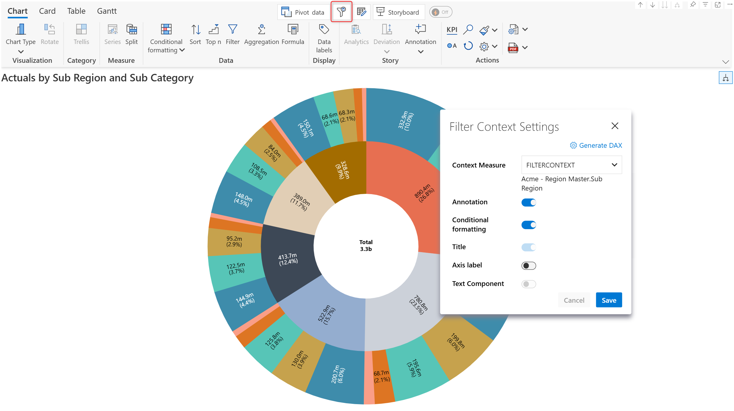 The fully loaded toolbar comes with a dedicated ribbon for charts, cards, tables, Gantt charts and the storyboard. We'll take a detailed look at the various moving parts of the Inforiver toolbar and how to navigate the different sections.&#x20;