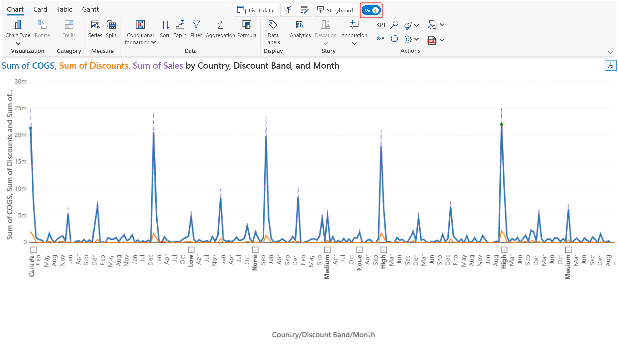 Charts with high data volume and density can be plotted significantly faster with the performance mode option. Enable the toggle from the toolbar for faster rendering. Please bear in mind that performance mode is supported for select charts.