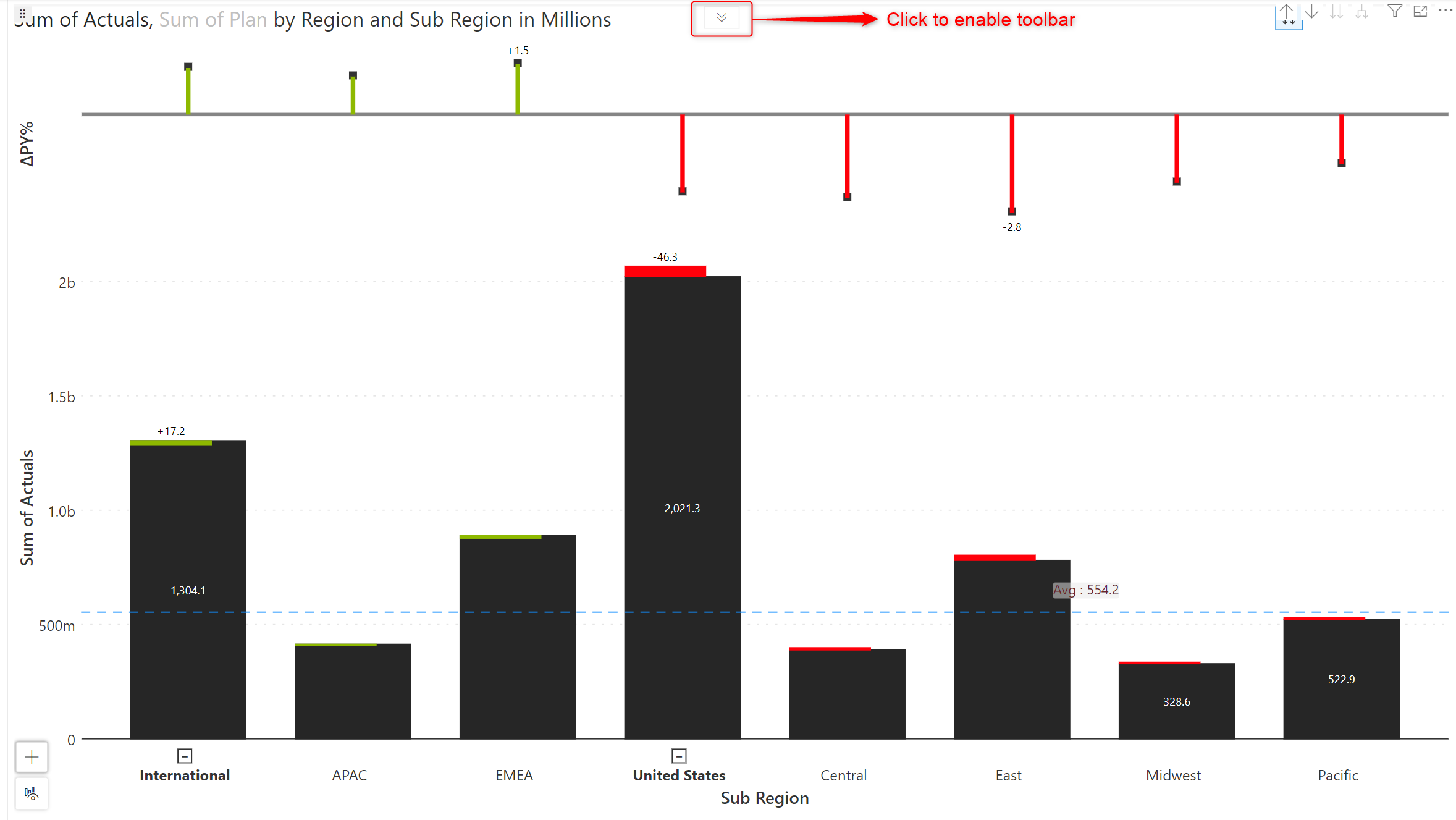 First things first - to enable the toolbar, after assigning data, hover over the top portion of the visual and click on the arrow icon.&#x20;