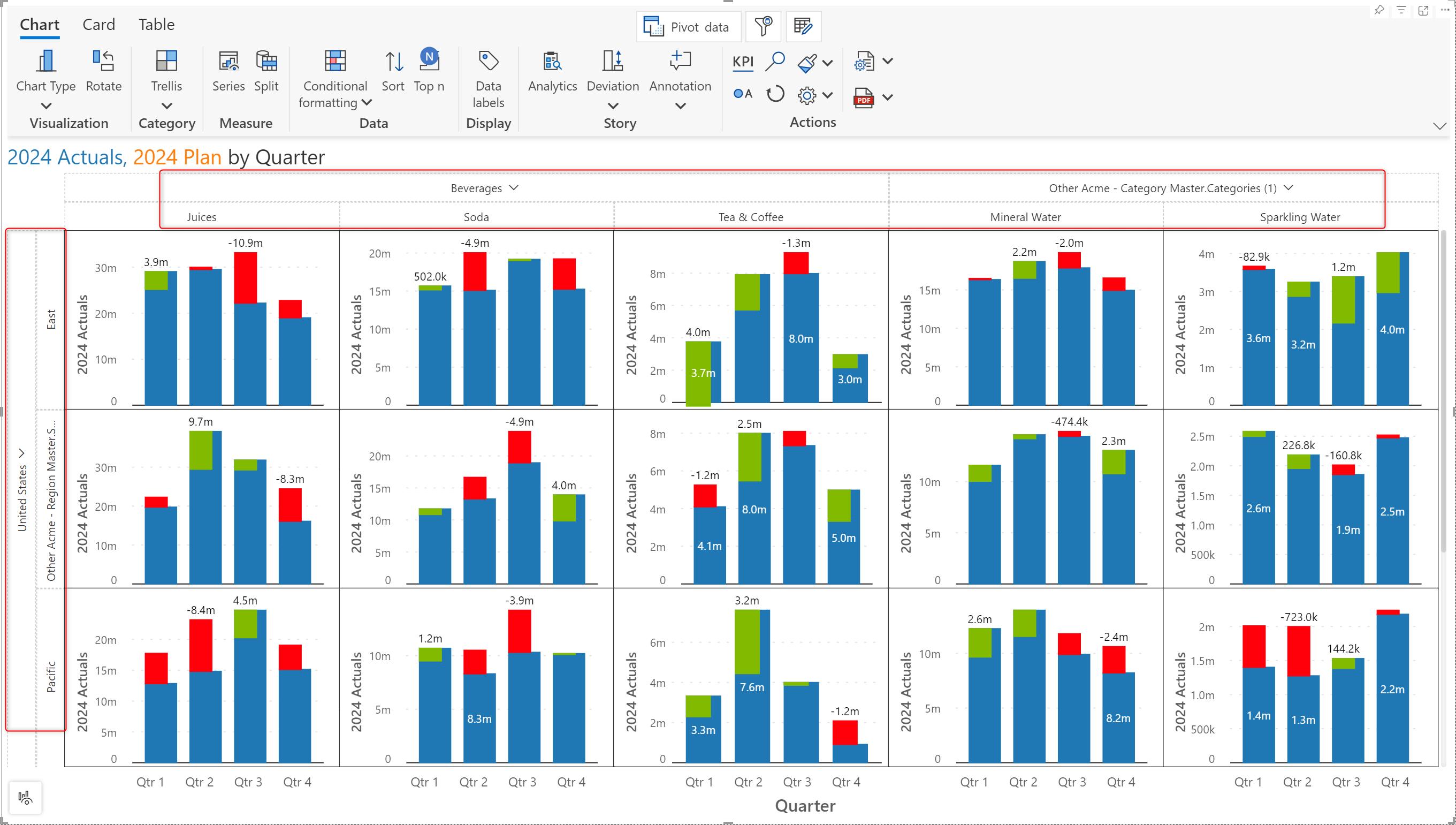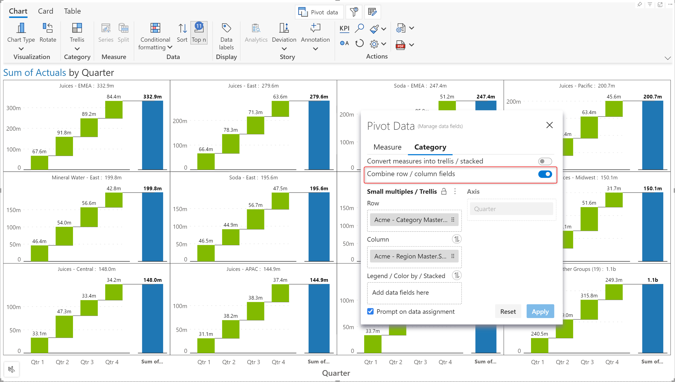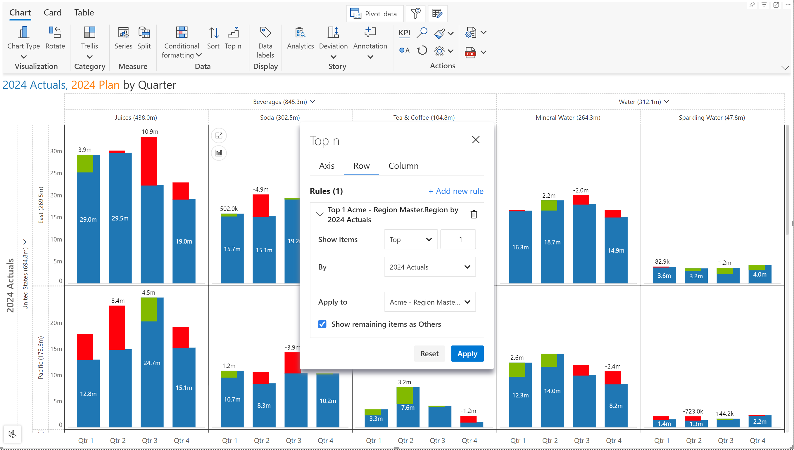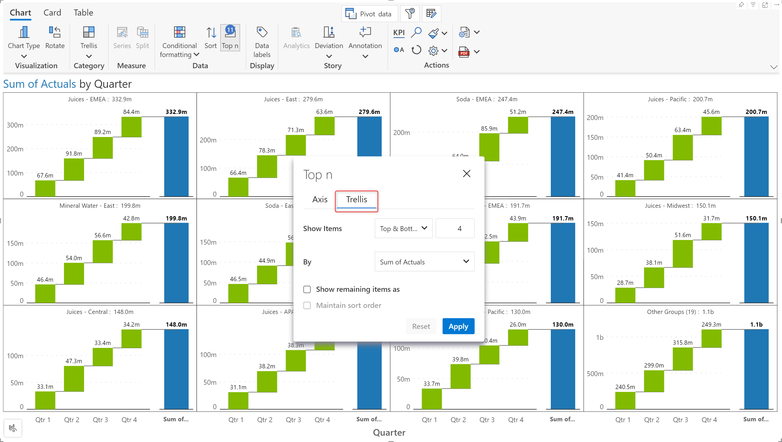 In trellis mode, you can rank the data in the rows and columns. Let's create a trellis depicting the sales actuals for product sub-categories across sub-regions and display panels based on their rank. To display the 3 sub-categories and sub-regions with the least sales, we can assign Top N rules at row x column level.