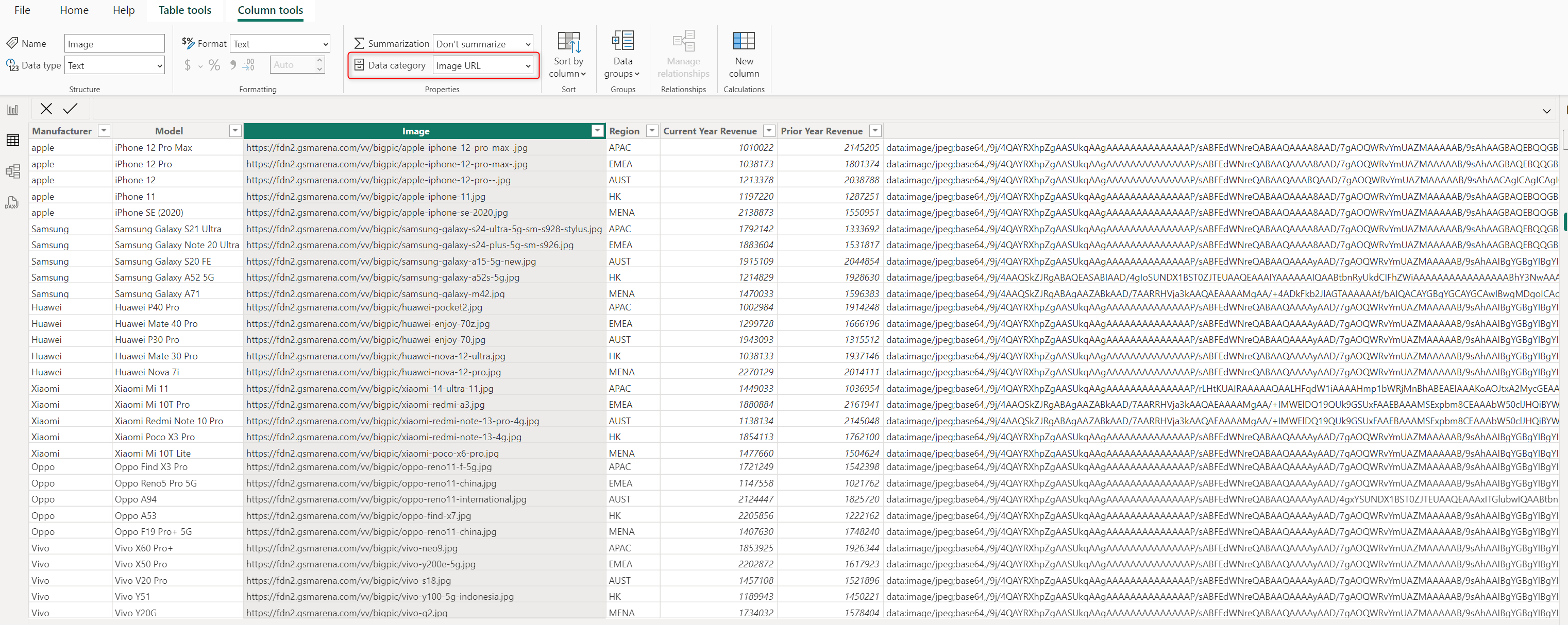 In order to use row-level or card-level images in your reports, ensure that the Power BI data category for the field containing images is set to **Image URL**.