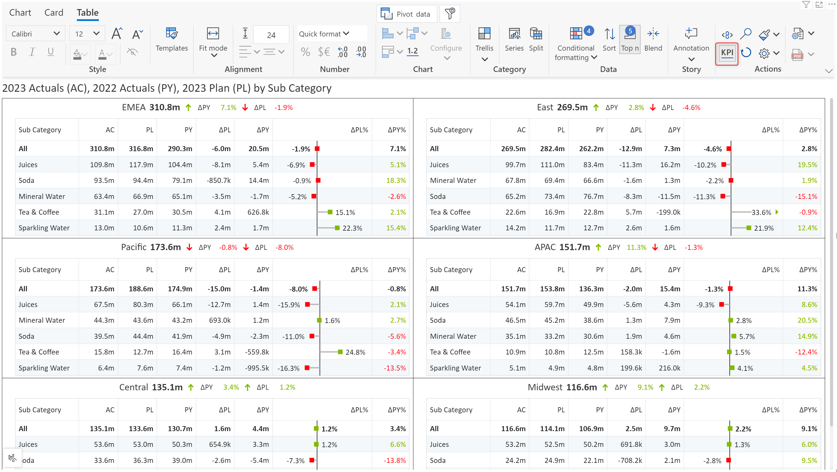 1. Analytics+ automatically adds measures to the comparison data wells based on the order of the measures: the first measure parameter is assigned to Actuals(AC), the second is assigned to Prior period (PY), the third is assigned to Plan (PL), the fourth is assigned to Forecast (FC) and subsequent measures are assigned to the AC bucket. You can drag and reorder the measures as required in the pivot data window.