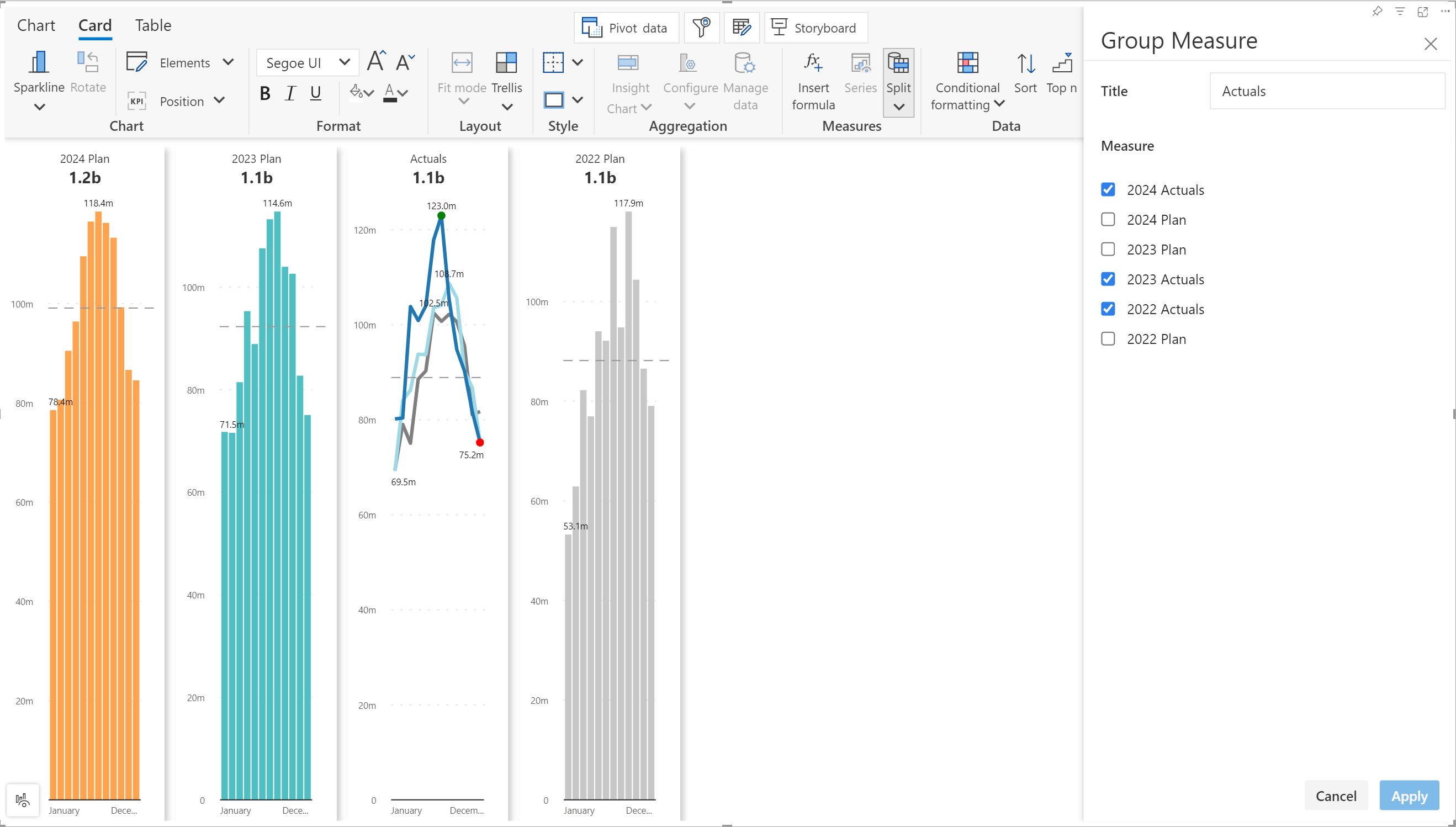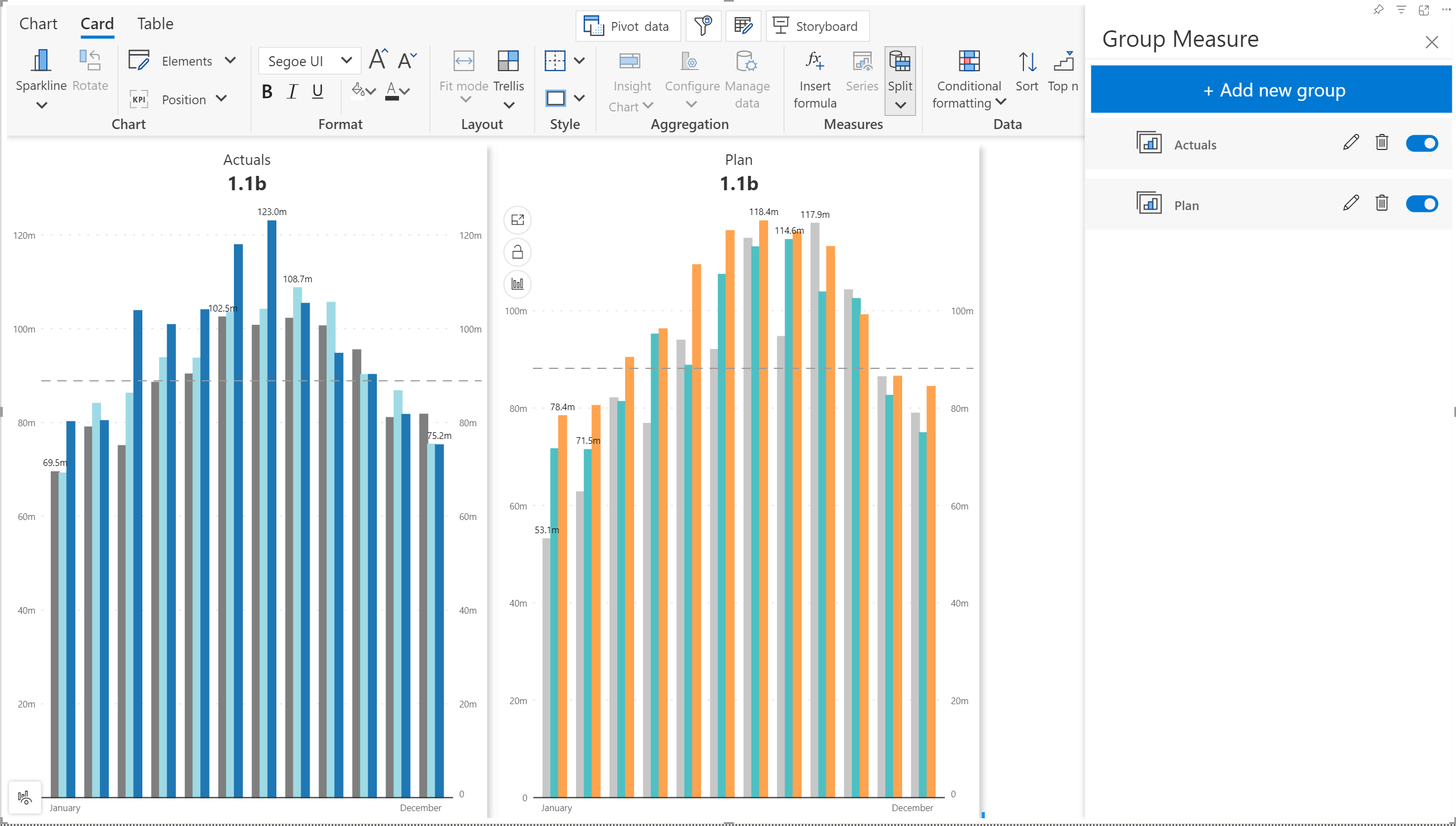 **Step 4:** Notice that a line chart is rendered for the group. You can customize the chart type for each panel after creating groups. In the example, we've created 2 measure groups for Actuals and Plan and changed the chart type to Column + column.