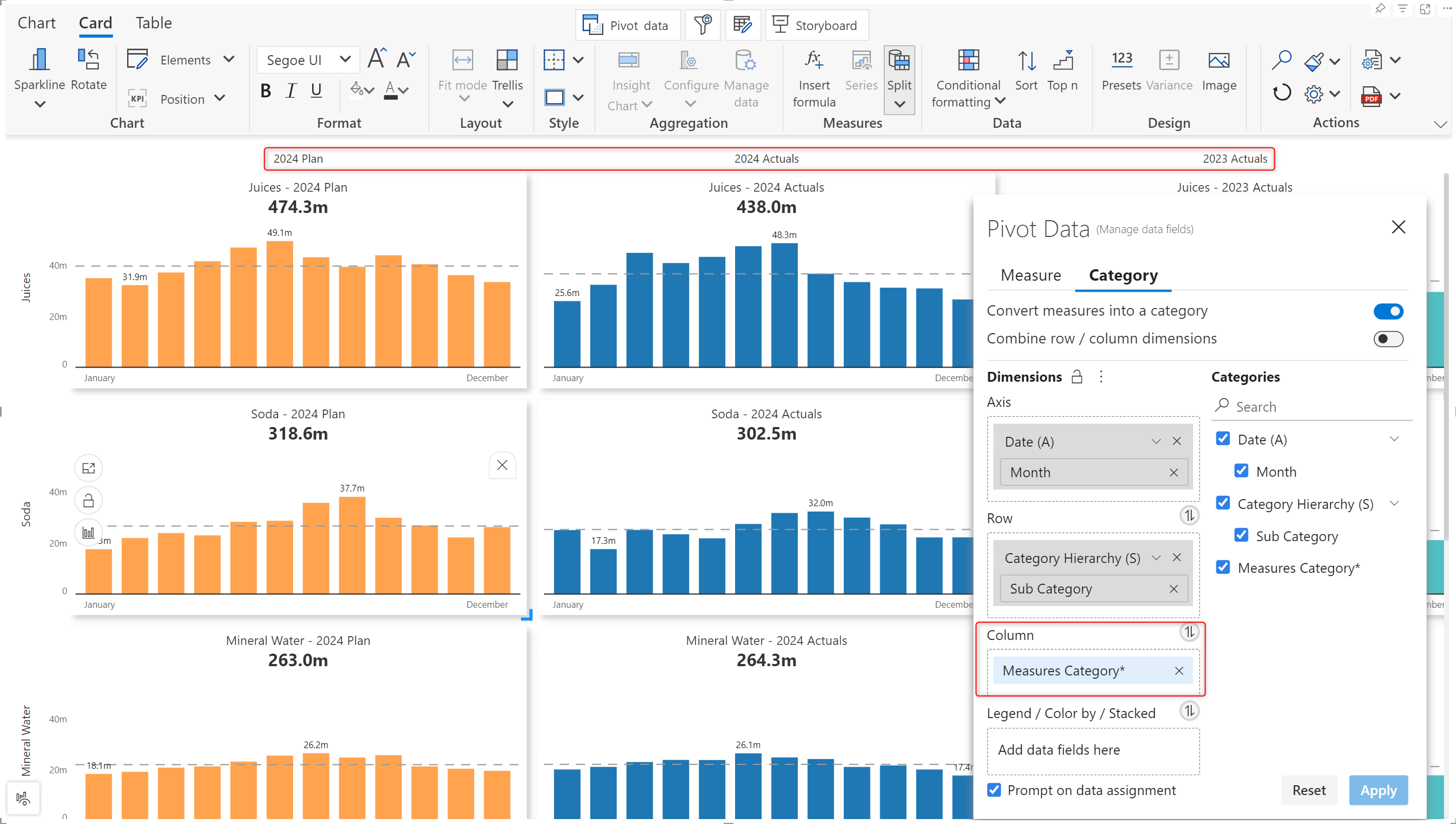 In this example, we have added Subcategory as the small multiples parameter. When the split option is enabled, a separate panel is created for each category and each measure.