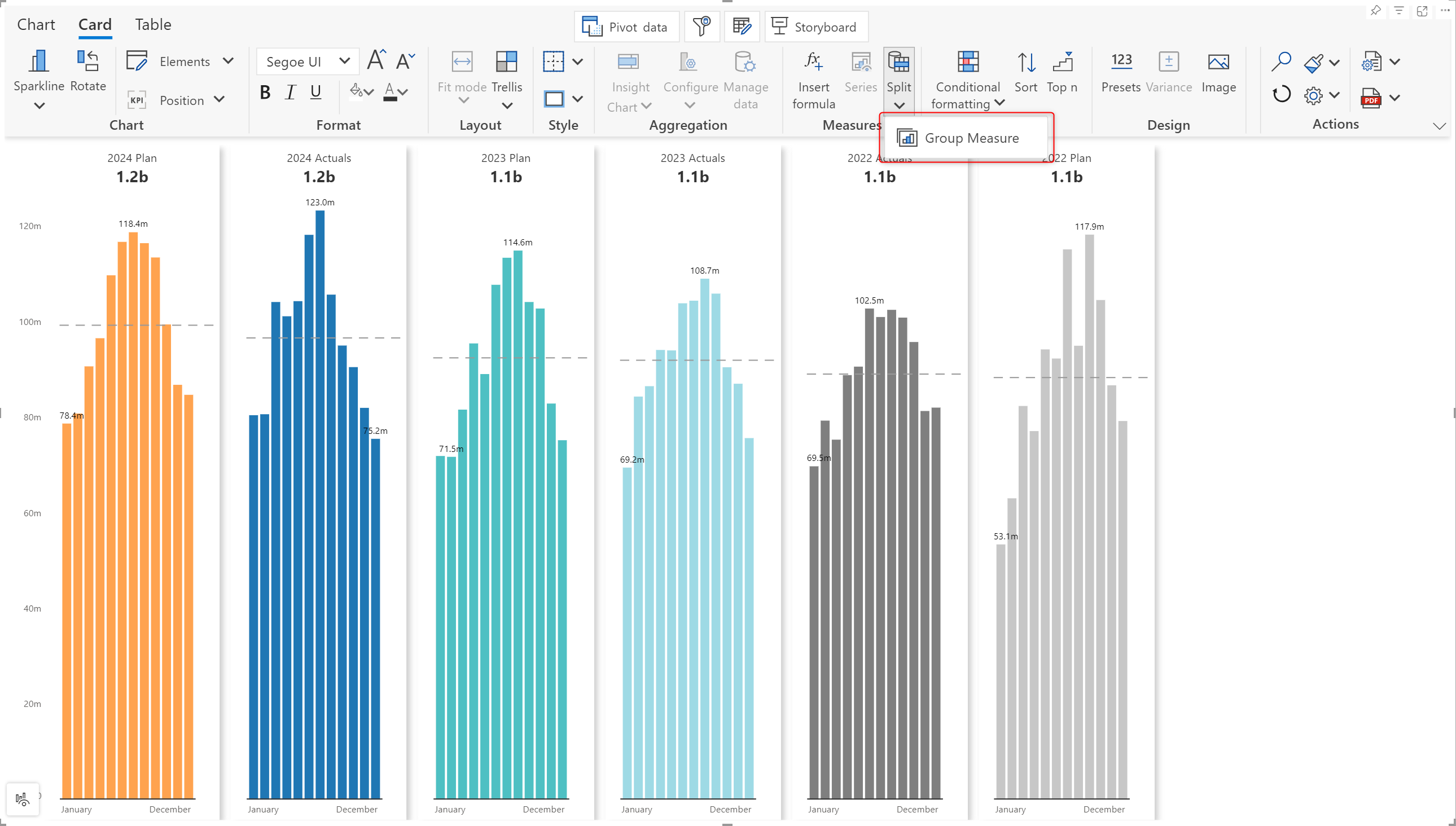 In this section, we'll discover the various options in Inforiver to split and group measures in Card mode.