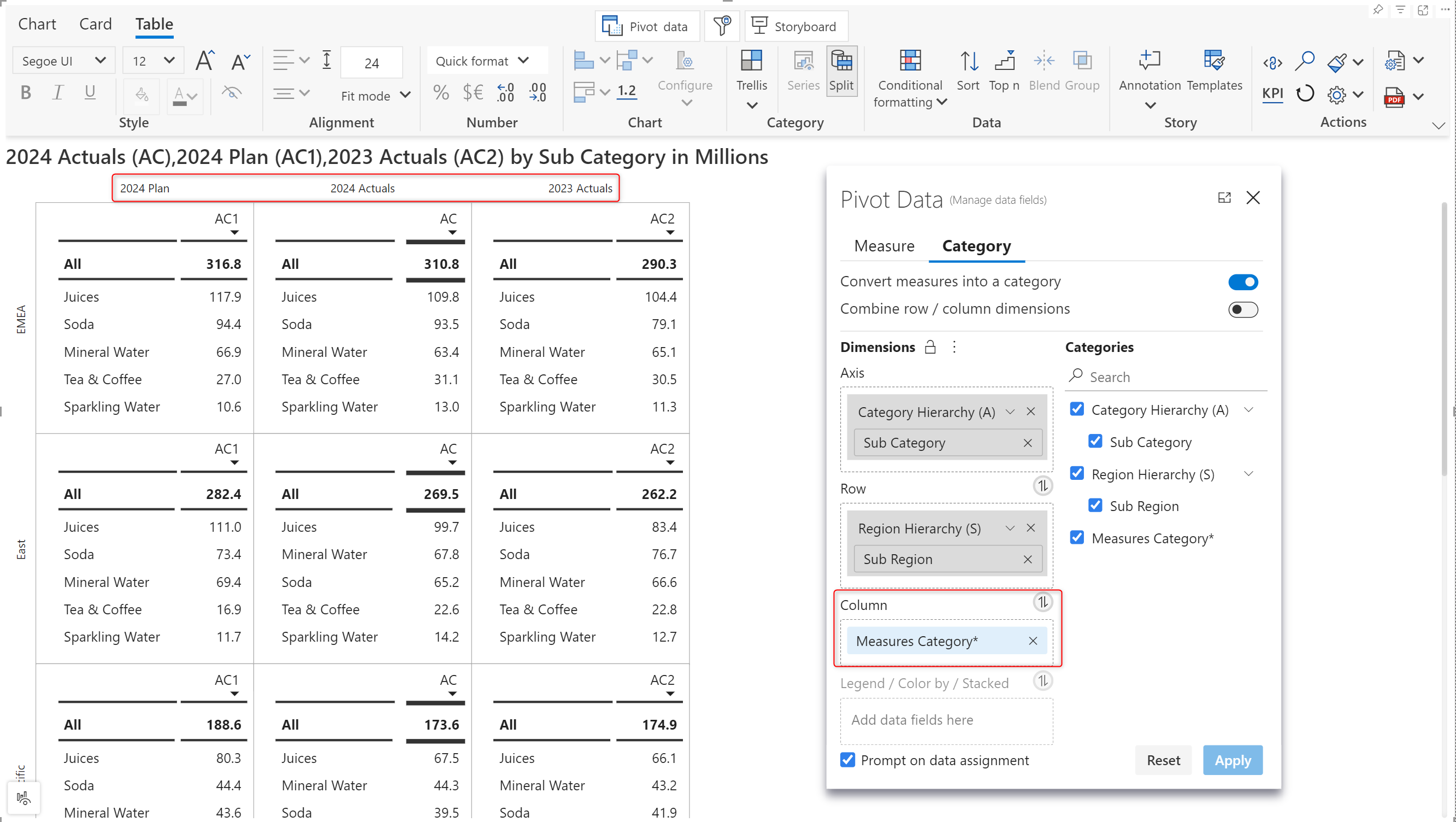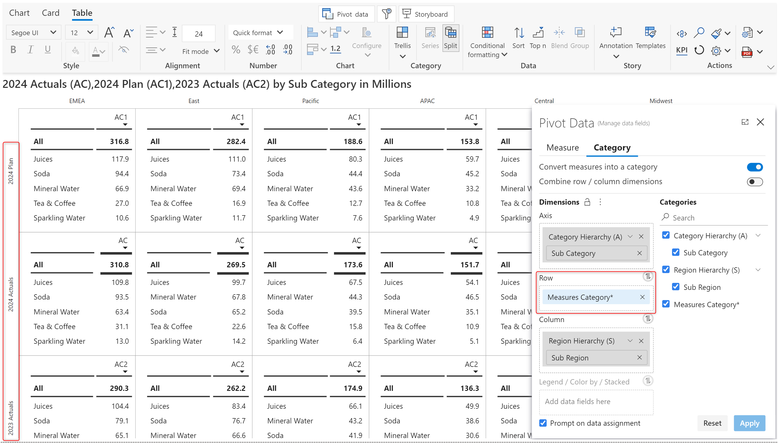 We've added a Sub Region as a small multiple parameter to demonstrate the measures category feature. Notice how the measures are rendered as separate rows when the split option is enabled.