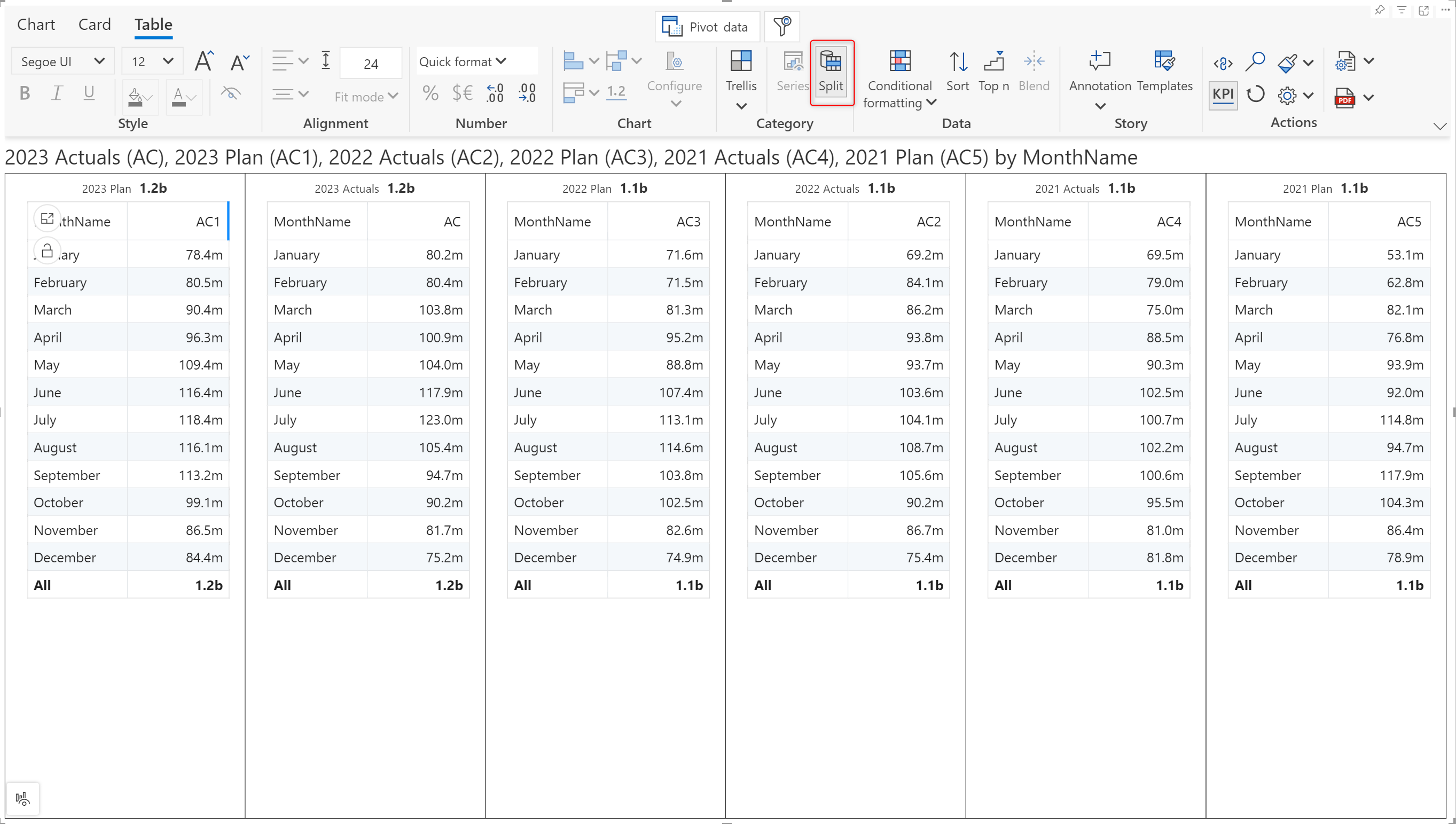 When you have multiple measures and categories in your table, you can display each measure in a separate panel. Click on the **Split** button in the toolbar.