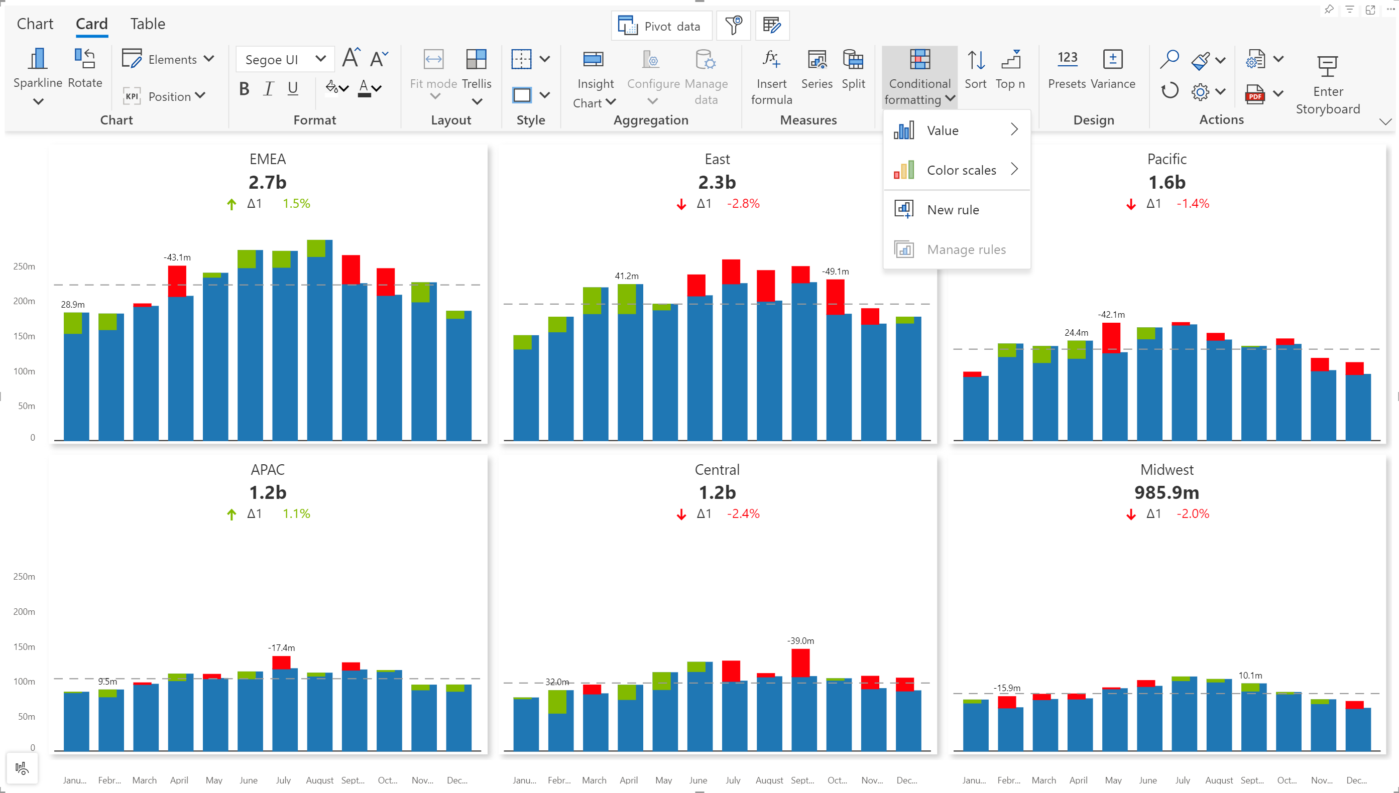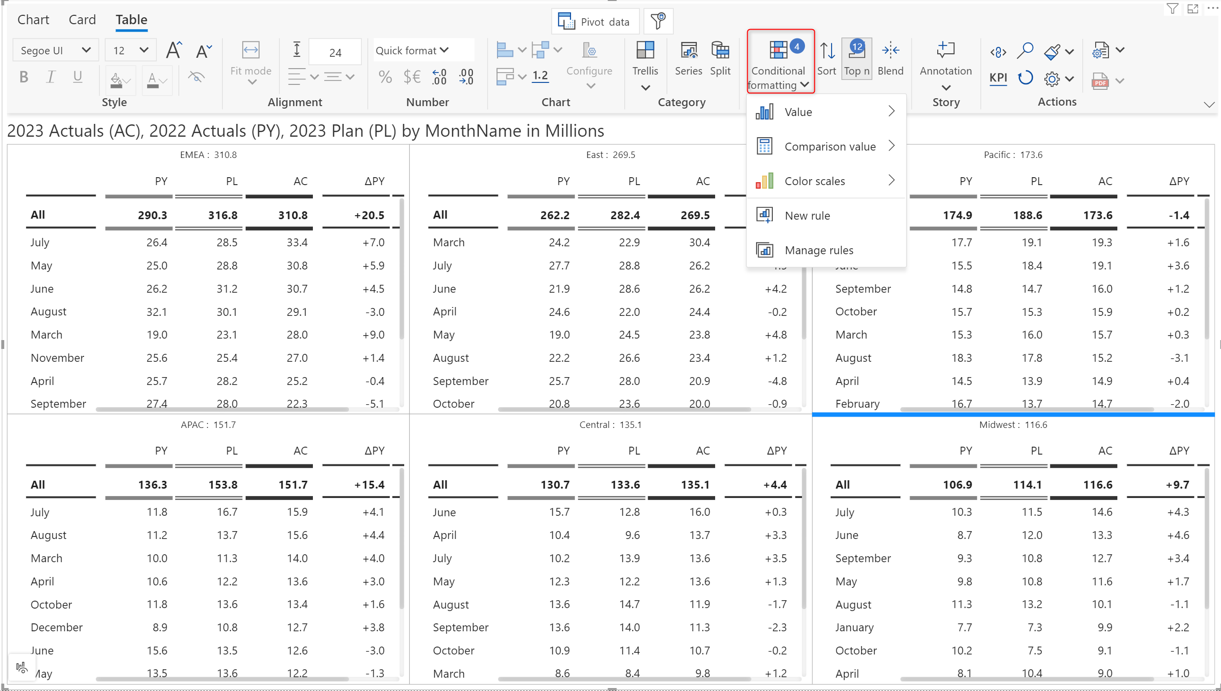 Conditional formatting in dashboards and reports is essential in drawing attention to specific performance areas. With Analytics+, you can apply rules and use formatting options to emphasize specific data points.