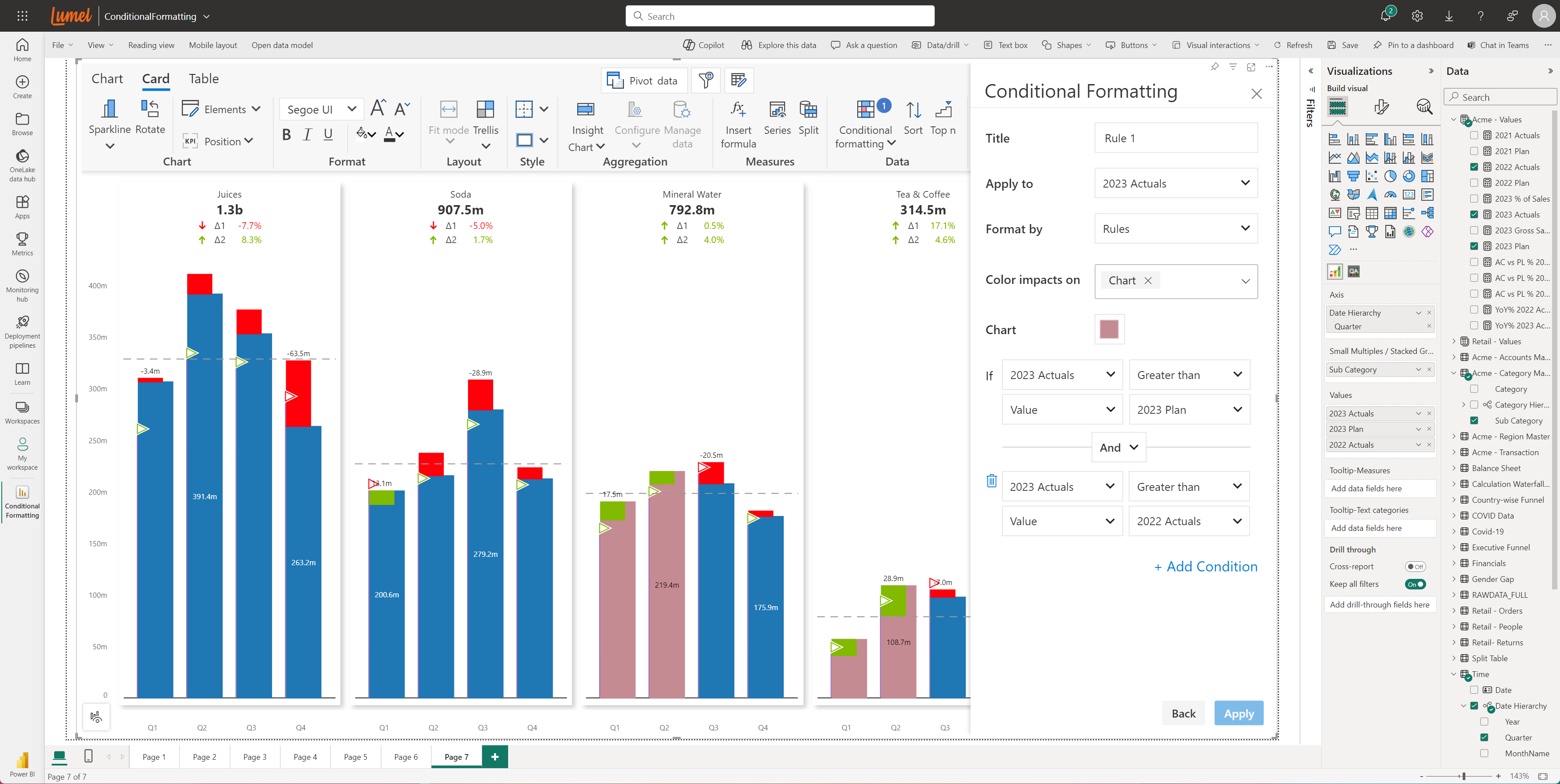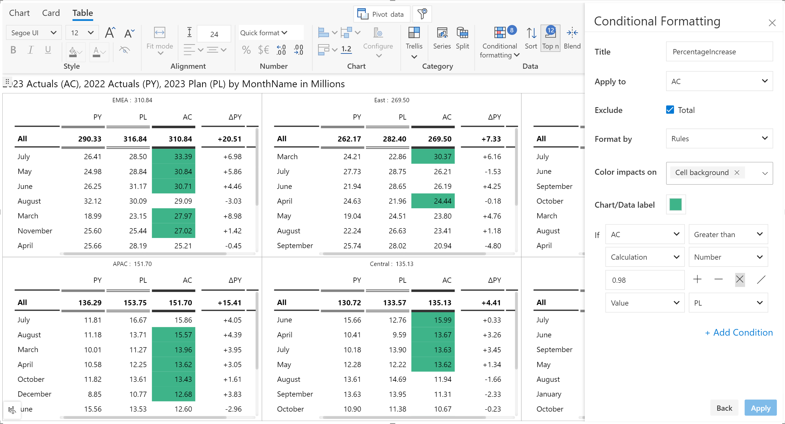 You can compare your measures against a threshold value and apply formatting if the condition is satisfied. In this case, we've changed the font color to green if AC exceeds 25m or the previous year's variance exceeds  4m.