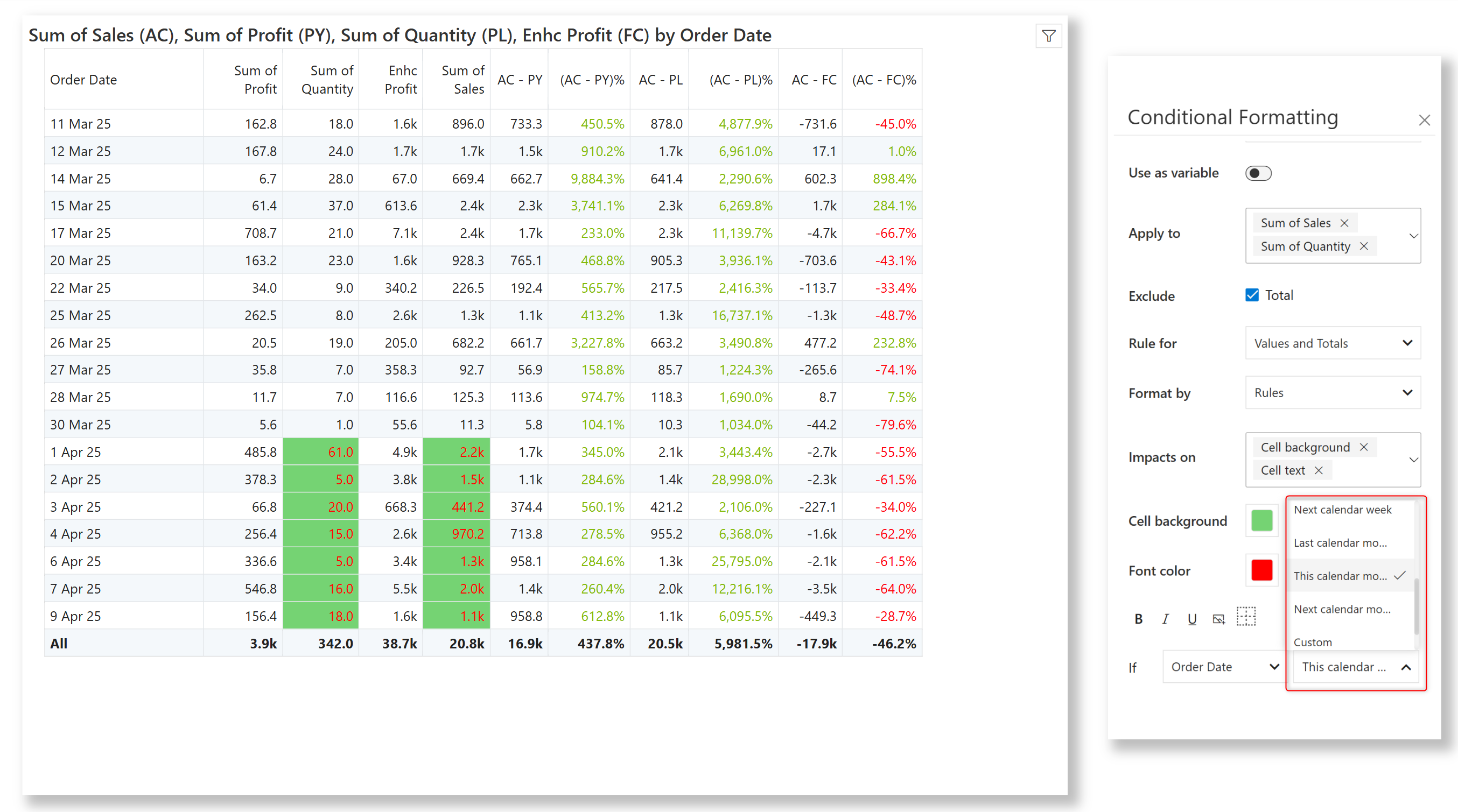 We've used conditional formatting rules based on relative dates to highlight the quantity and sales for the current month.
