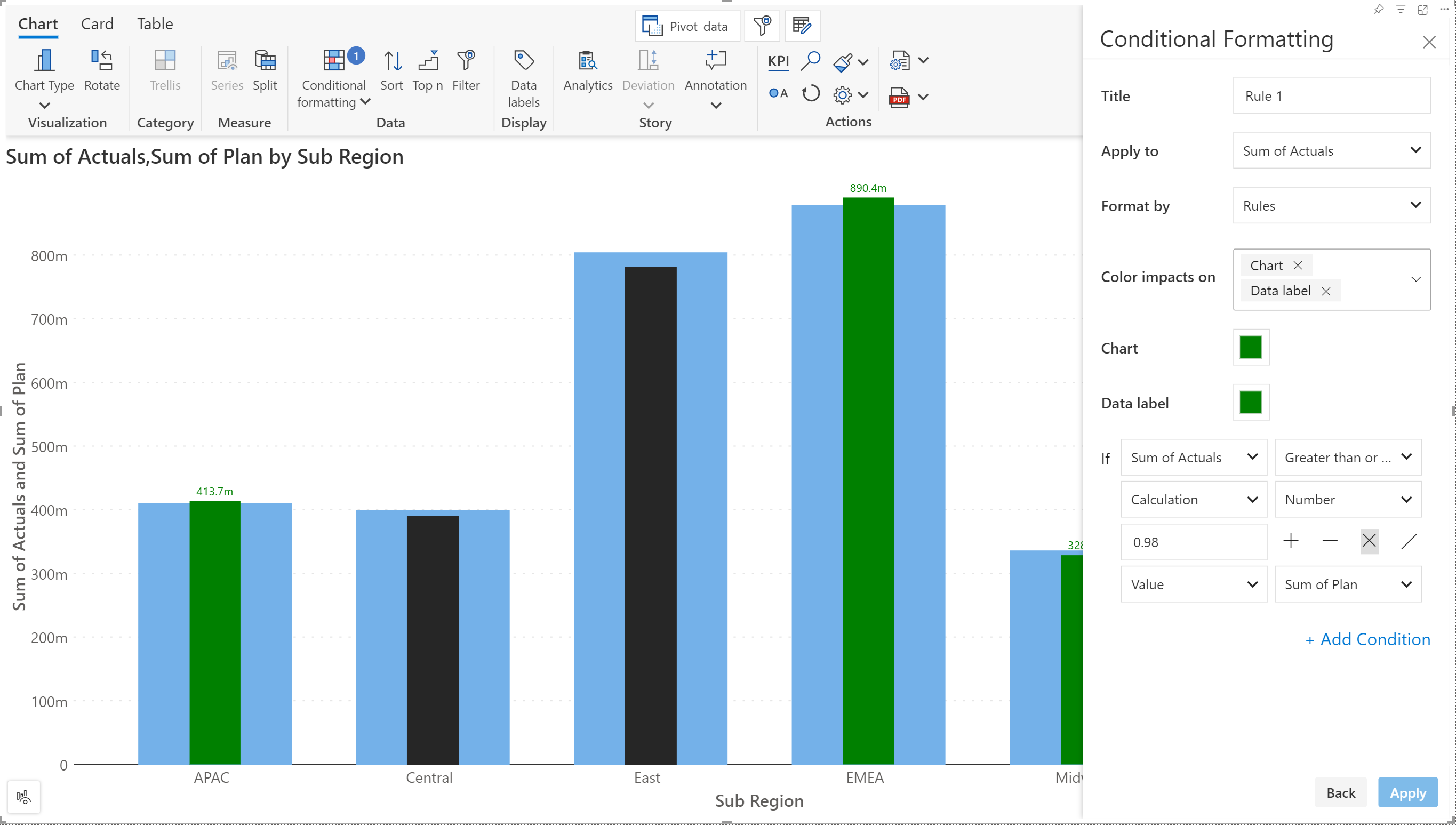 <figure><img src="https://3132984990-files.gitbook.io/~/files/v0/b/gitbook-x-prod.appspot.com/o/spaces%2FbOoZhPvC57Z0CNgep4Ib%2Fuploads%2Fqy1ufWHlfmxURnJ0y4dd%2Fimage.png?alt=media&#x26;token=4cd8e2cb-8a67-4142-b319-23d0e814a54e" alt=""><figcaption><p>Conditional formatting based on column comparisons in a chart</p></figcaption></figure>