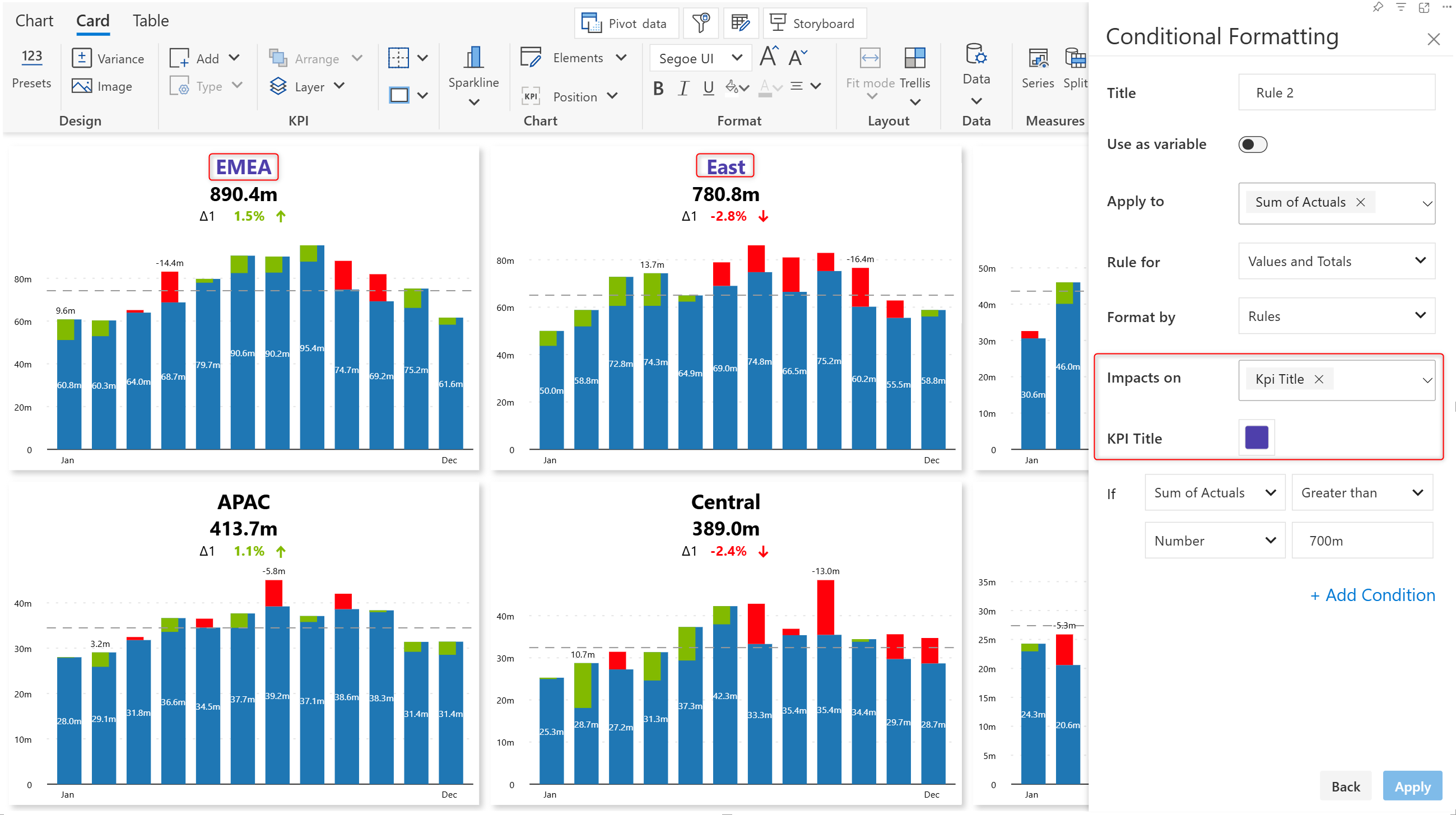 Highlight trends by applying conditional formatting rules to insight charts. Choose the"Kpi Insight Chart" for the **Impacts on** option to apply formatting to the insight chart.