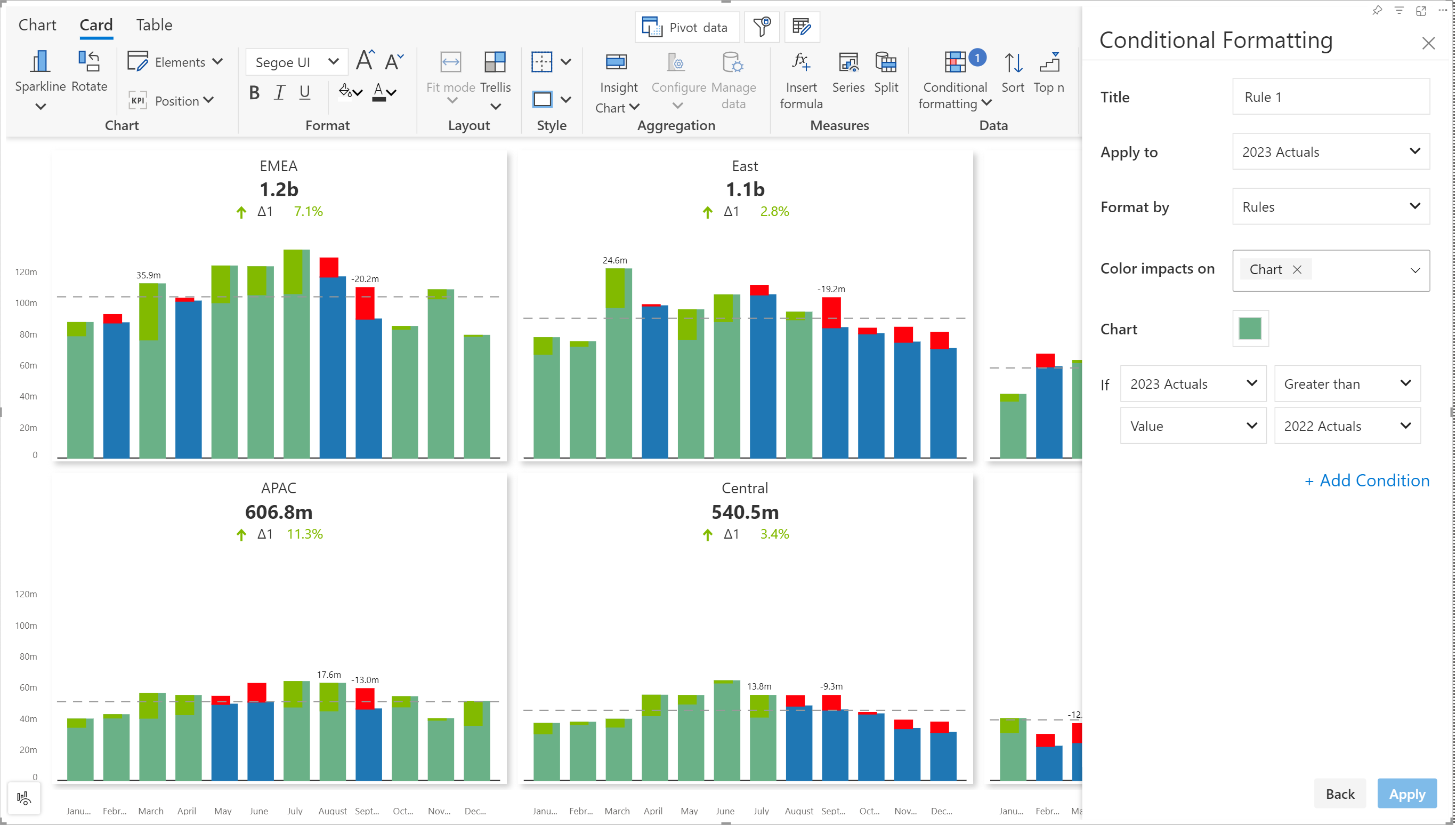 In this example, we have used a conditional formatting rule to highlight the bars where 2023 Actuals > 2022 Actuals.