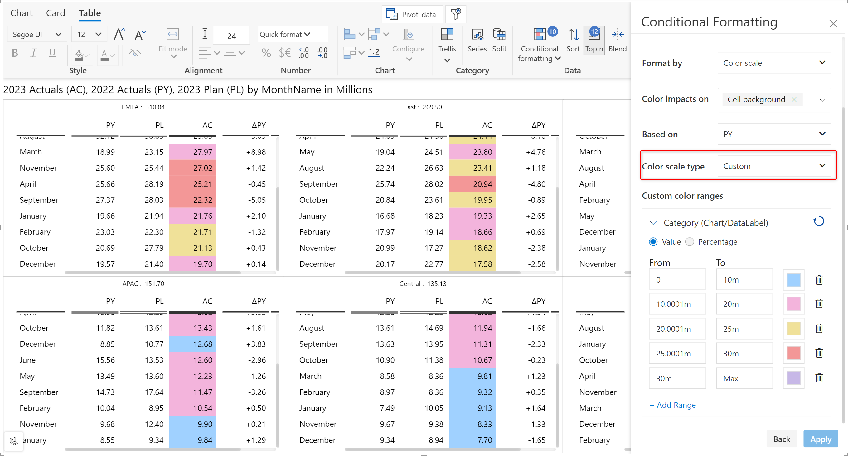 We've used custom ranges based on the PY values in this table.