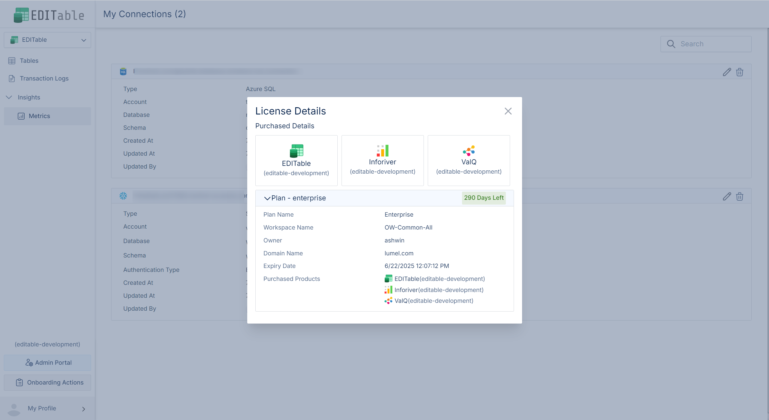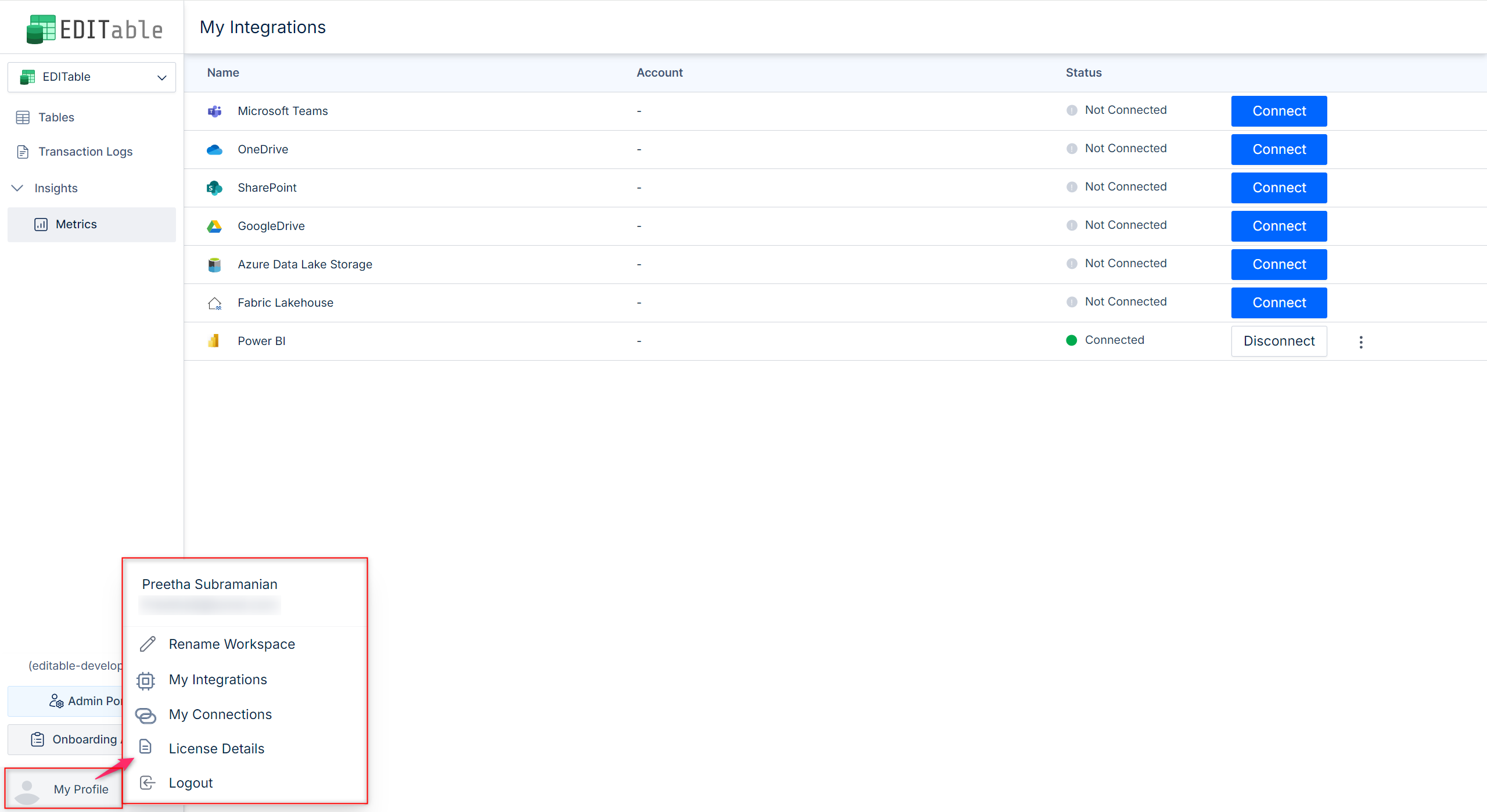 The 'My Profile' section in the EDITable console allows you to view and manage your integrations, database connections, and license details.