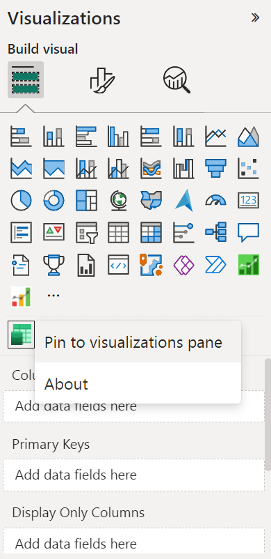 8. If you want the visual to remain on the visualizations pane for all reports, right-click on it and select **Pin to visualizations pane**.