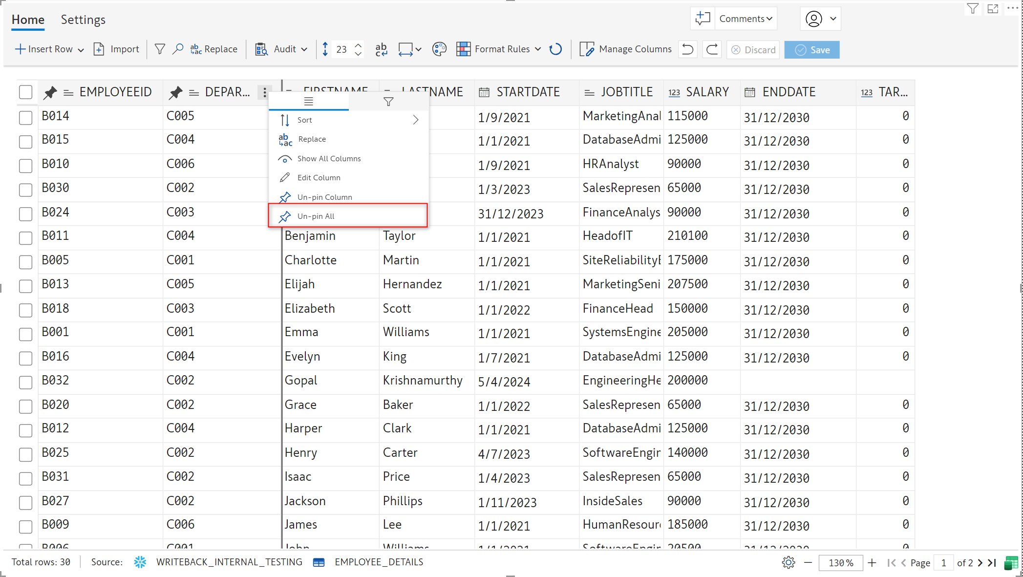 4. To unpin all of them, select **Unpin All** and the columns will return to their original positions.