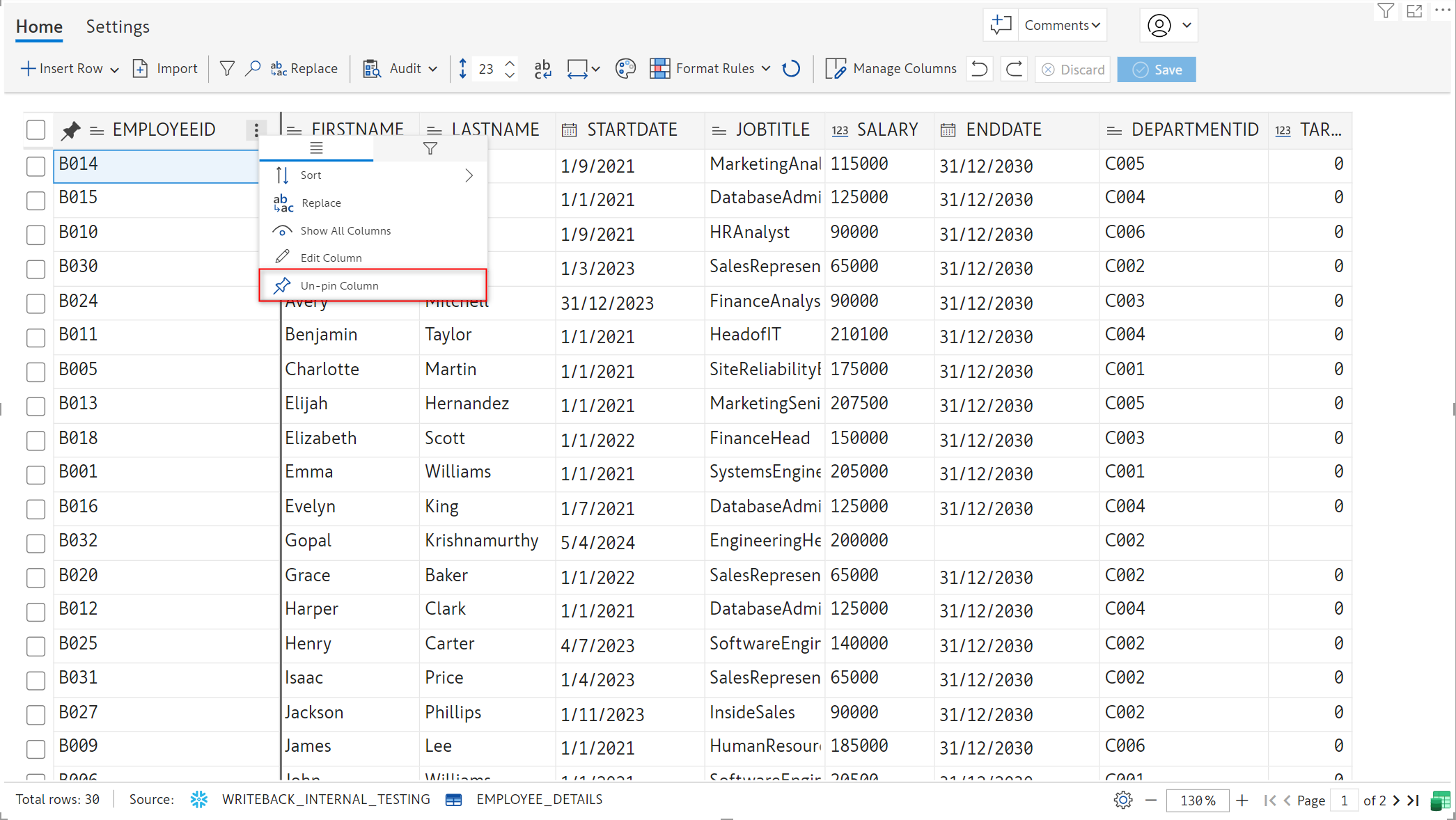 2. To unpin the column, choose **Unpin Column** from the same menu on the header.