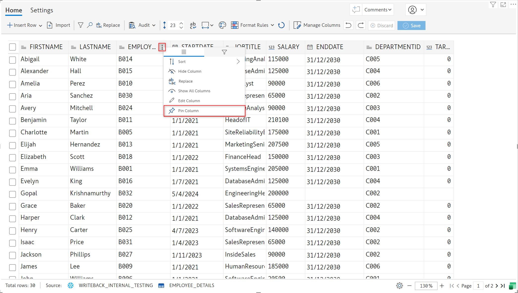 1. Hover over the column header you want to pin, then click the three-dot menu and select **Pin Column** to pin it to the left. We will pin the 'Employee ID' column here.