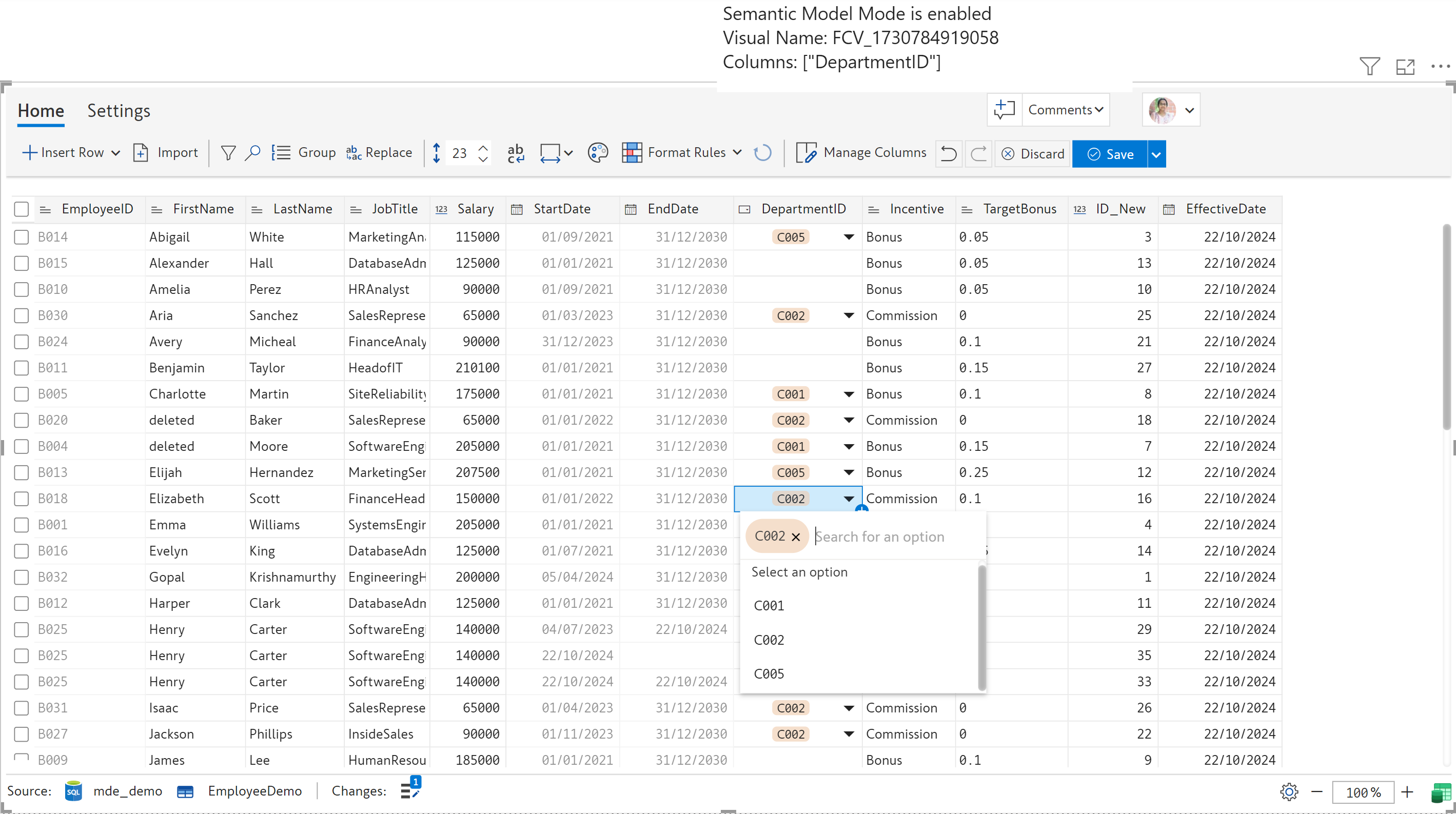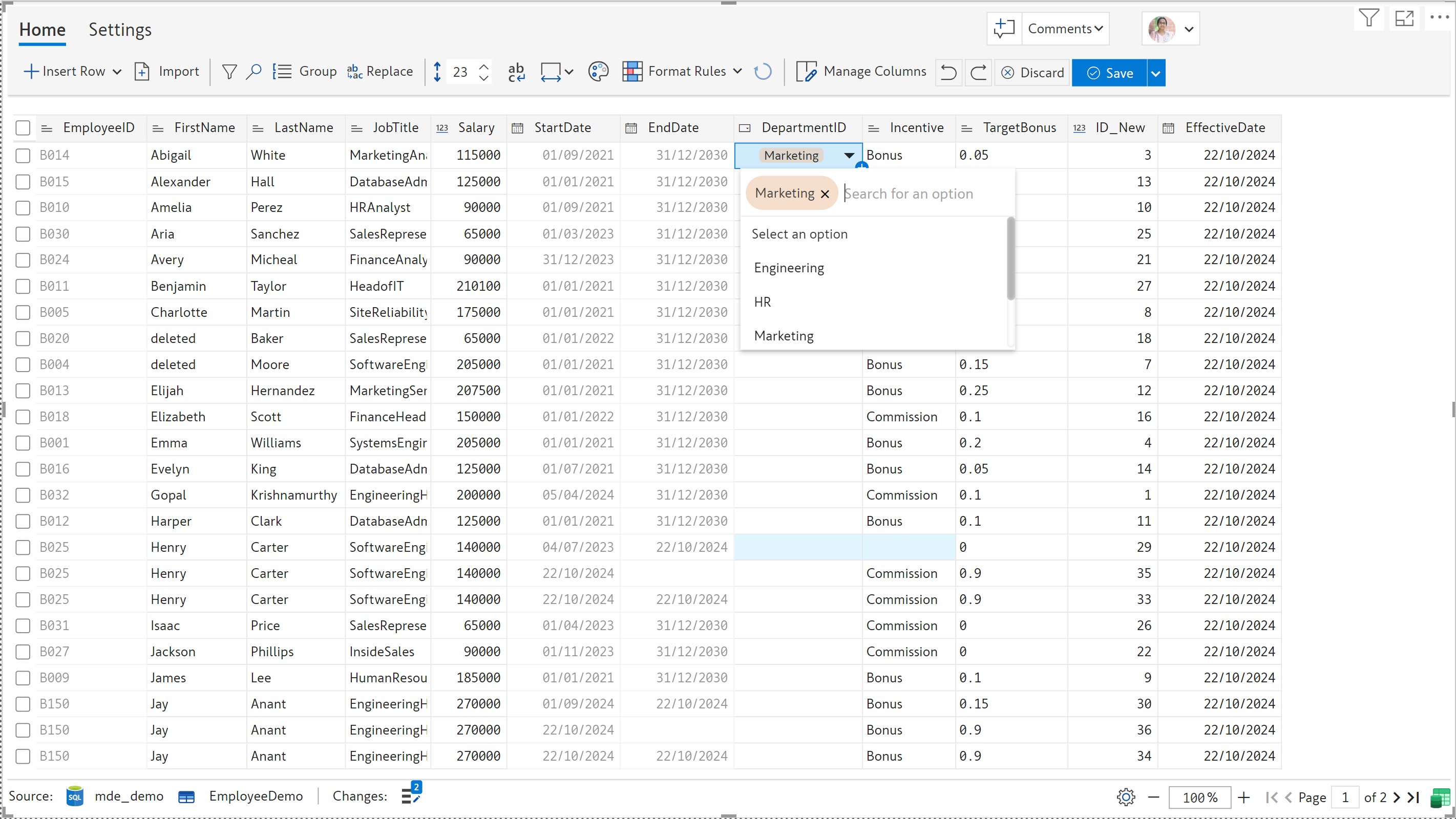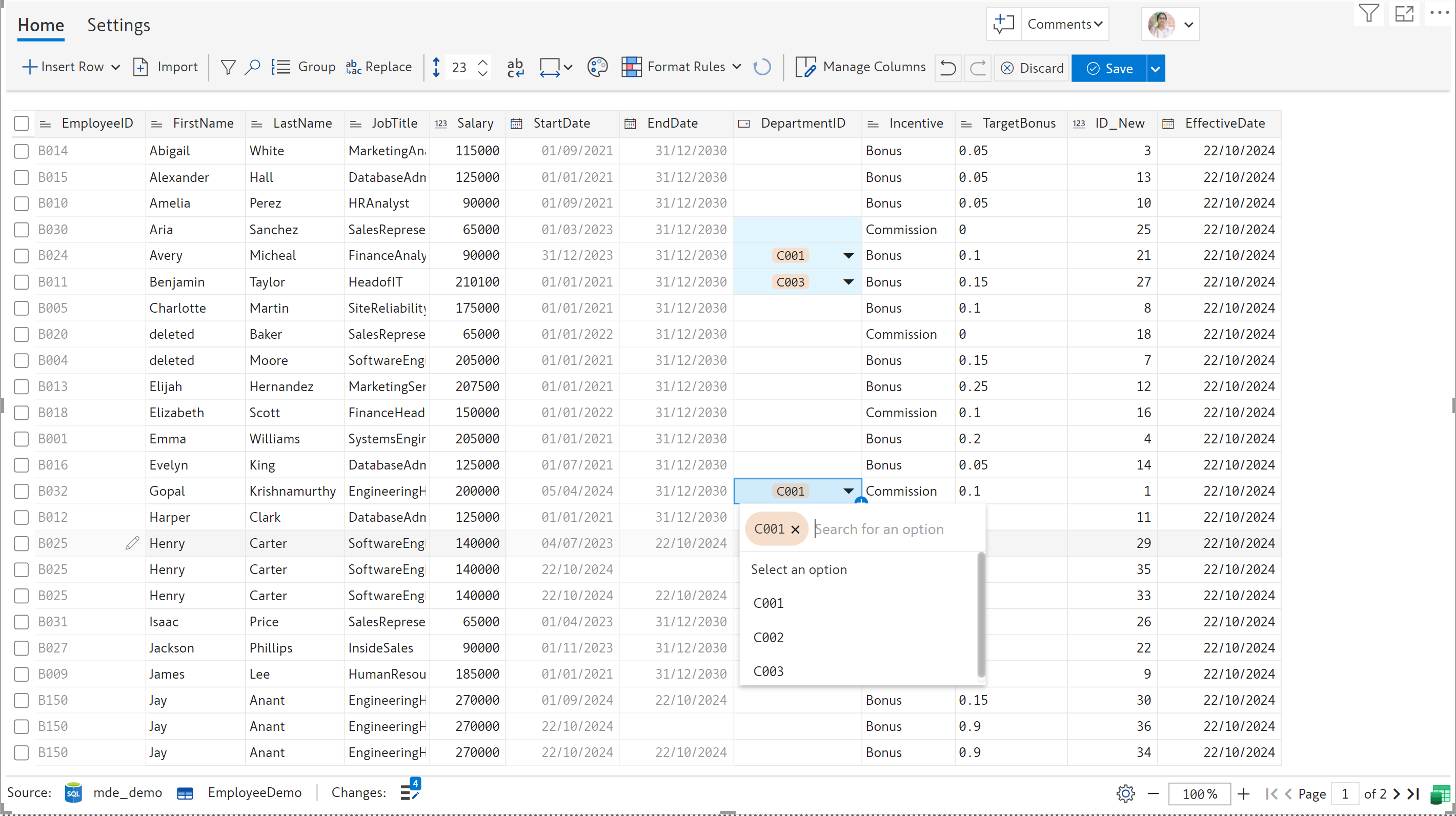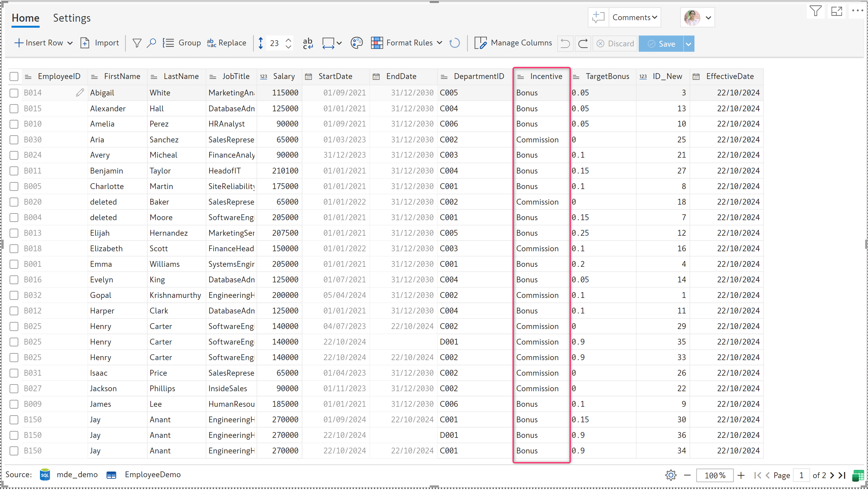 If you choose this option, EDITable creates a distinct list of options from the existing values. In the table below, the ***Incentive*** field already contains the following values: ***Bonus*** and ***Commission***. These two values are available throughout the field.