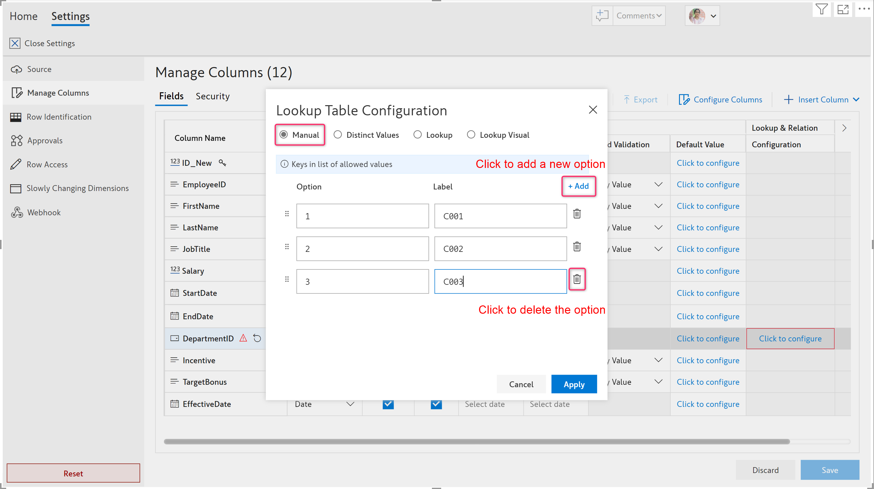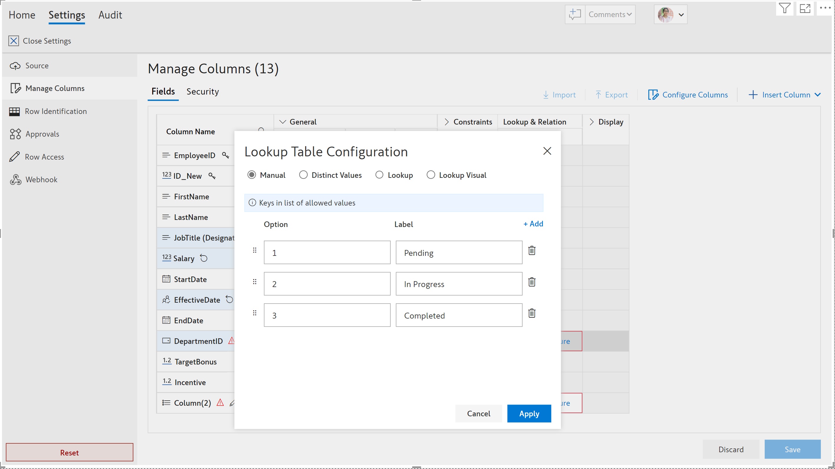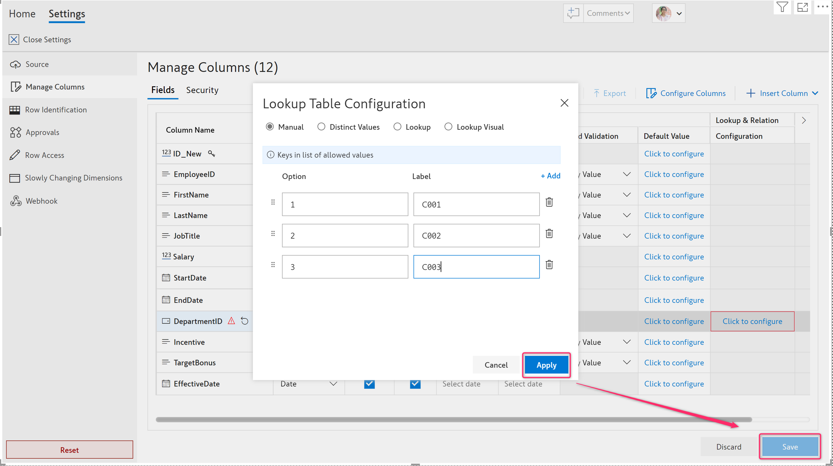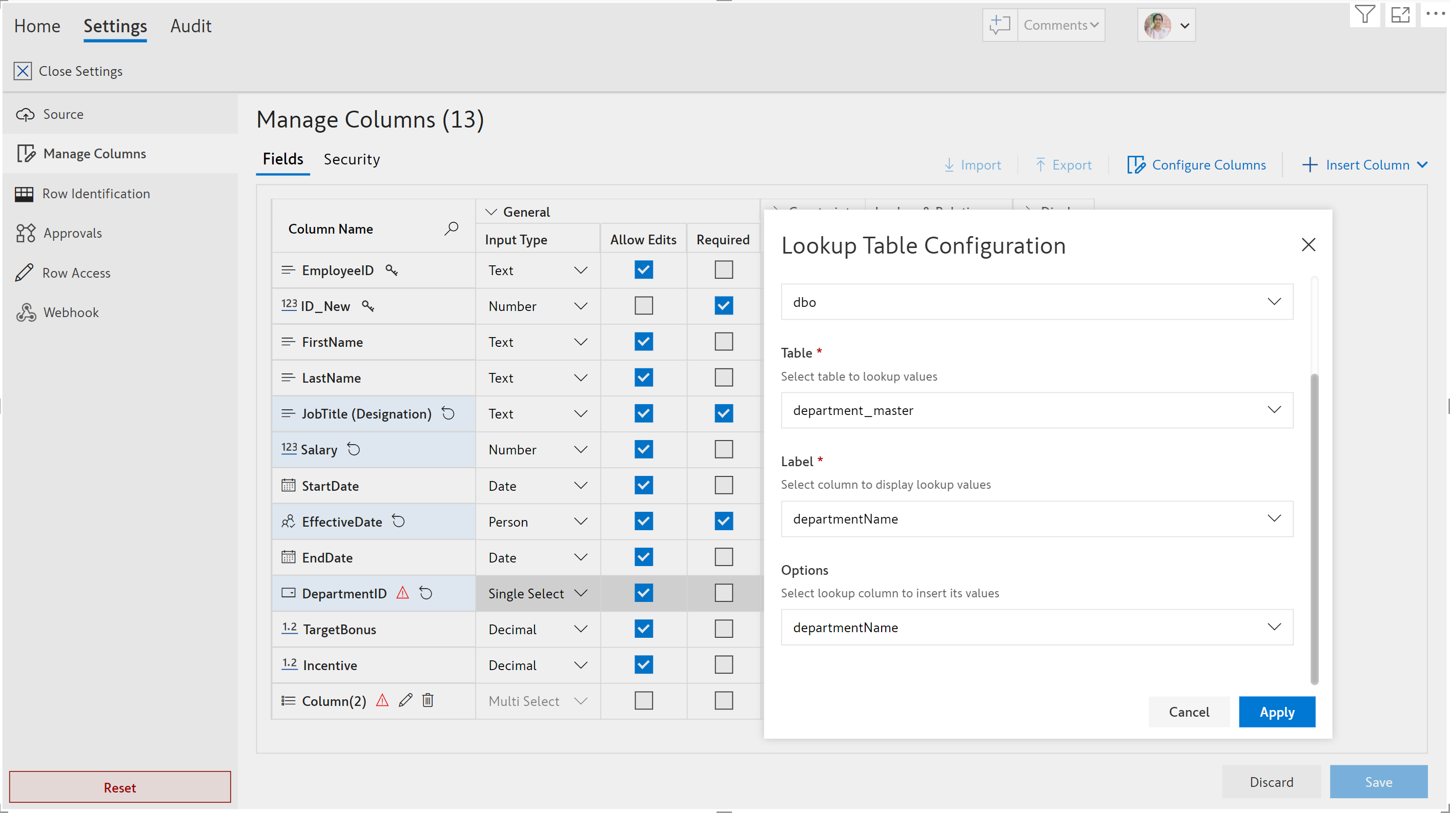 2. Click **Apply** after entering all the details as shown below and then **Save** the configuration. EDITable fetches the values from the configured field in the table.