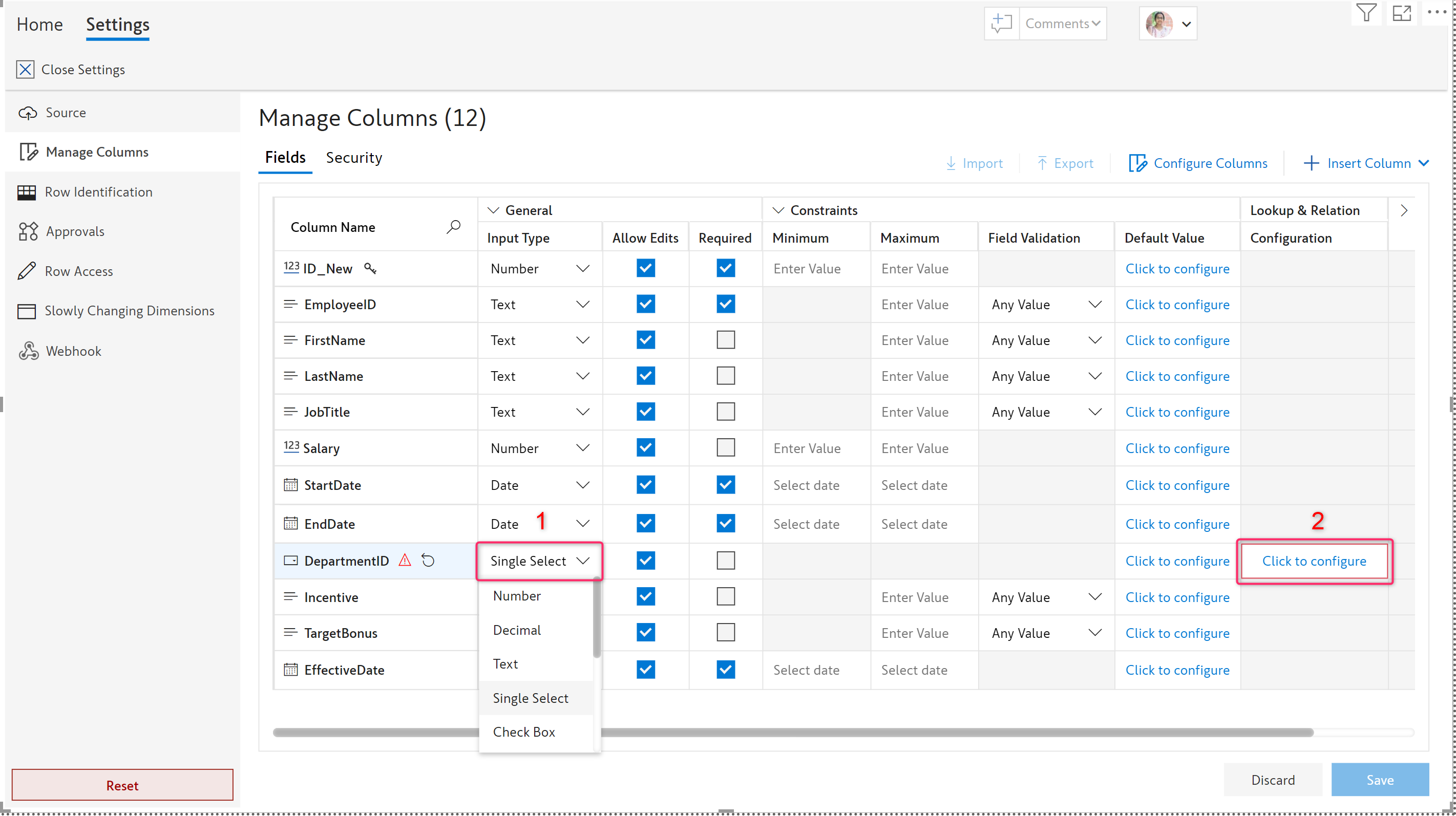 1. Choose **Single Select** in the Input Type field for the Department ID. As soon as you choose, the 'Lookup & Relation' section gets enabled.&#x20;