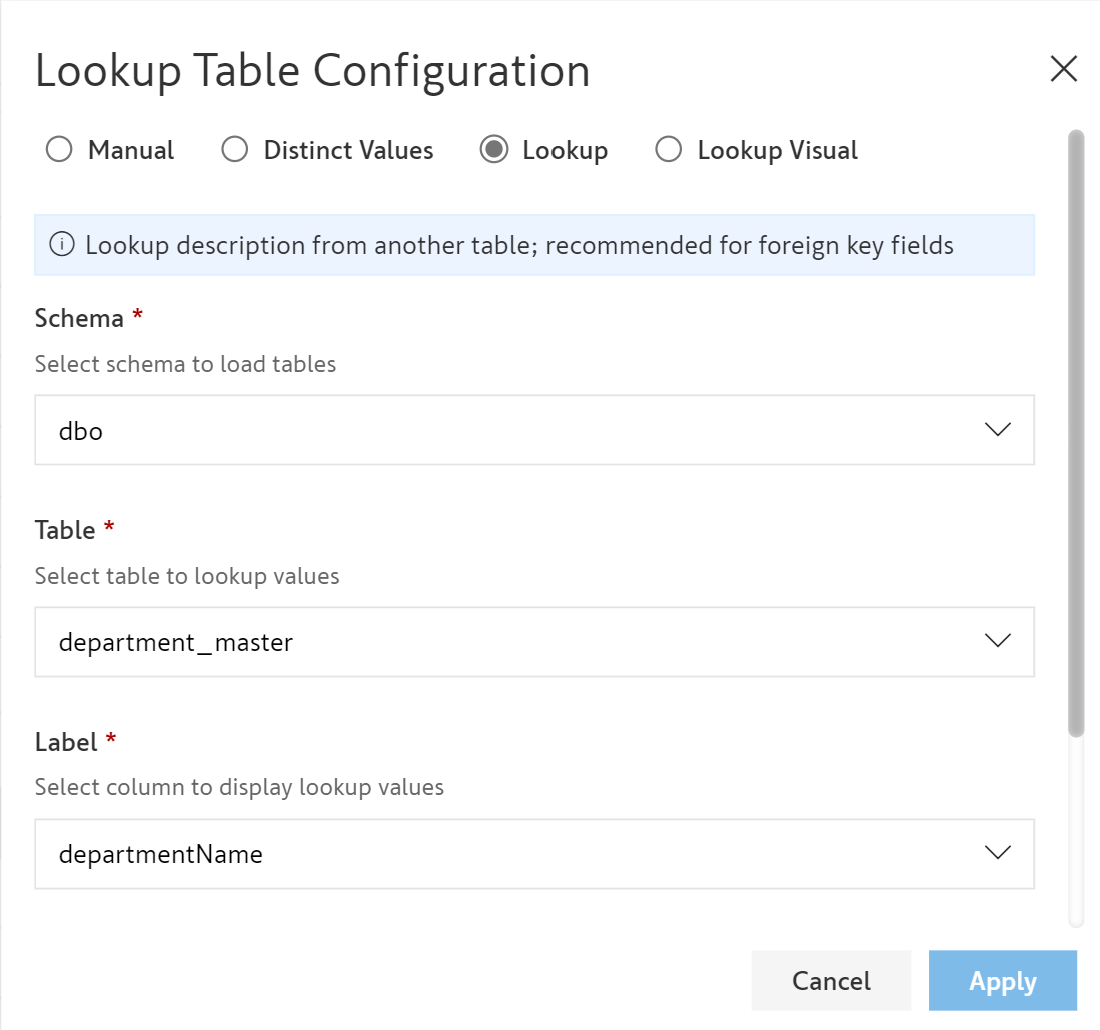 1. When you click Lookup, the below pop-up opens where you can enter the name of the schema, table, label, and the options from where the dropdown options should be sourced.&#x20;