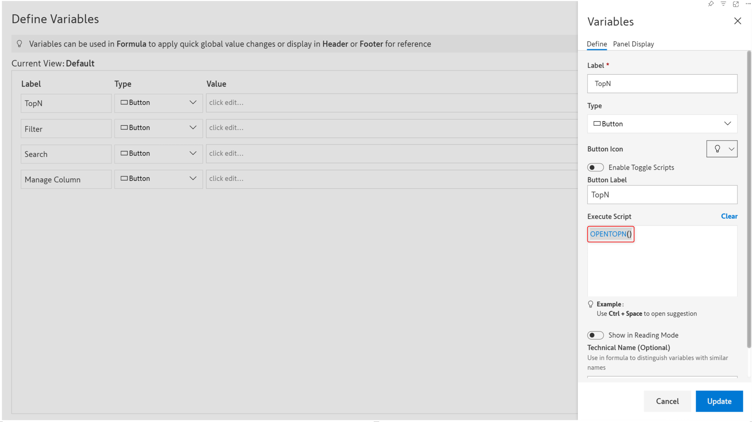 Use variables, on-load, and on-data-change scripts to open the TopN interface without requiring access to the toolbar.