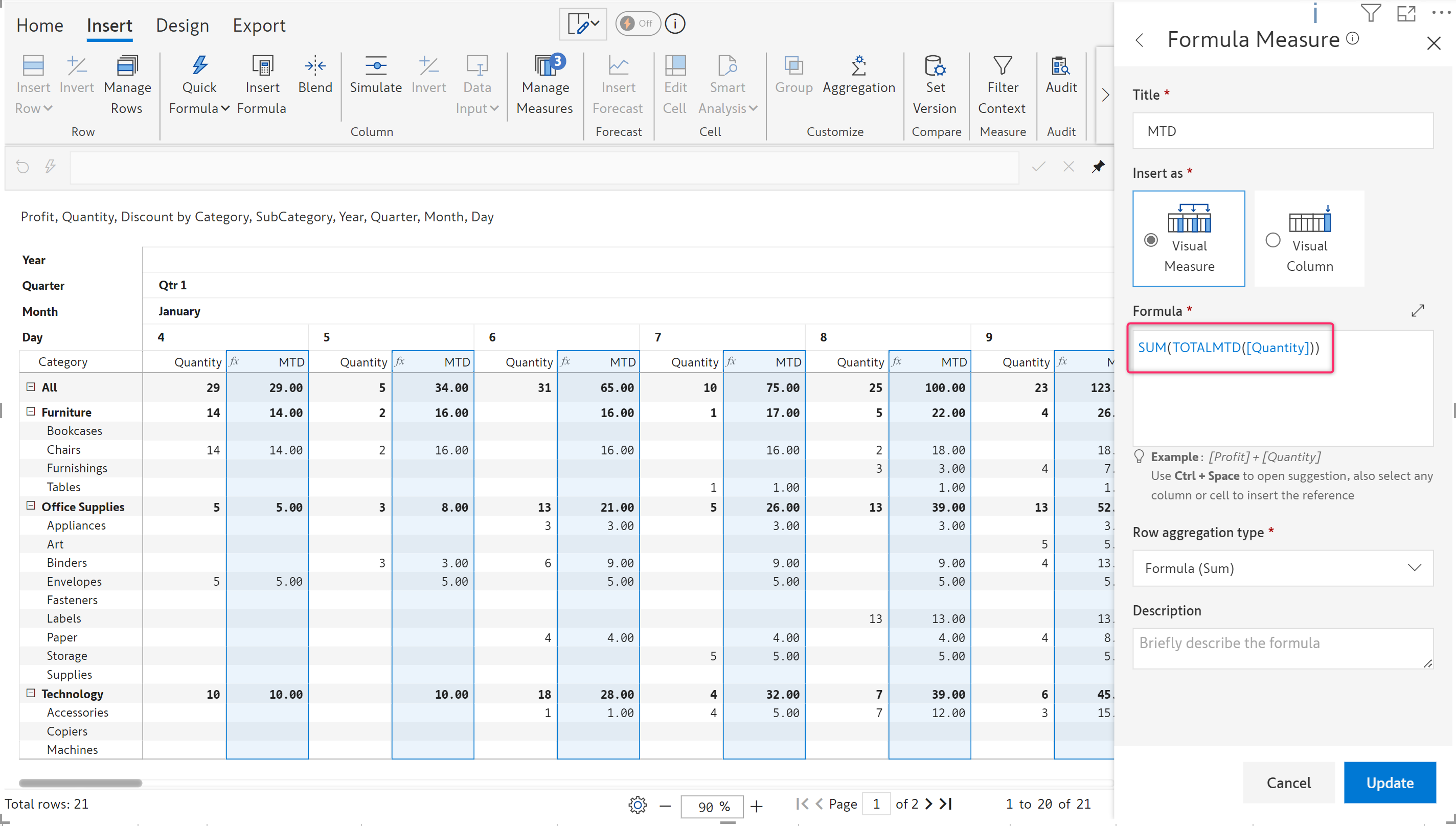 Find below an example in which the quantity is cumulatively summed every month-to-date.