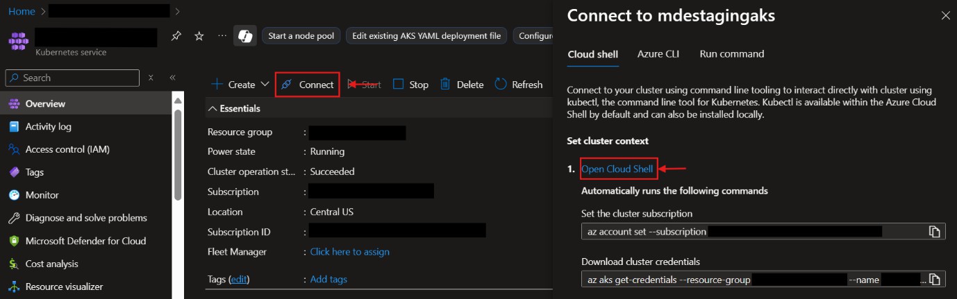 * From the AKS **Overview** tab, select **Connect**, then use **Open Cloud Shell** to set the subscription and configure the cluster credentials.