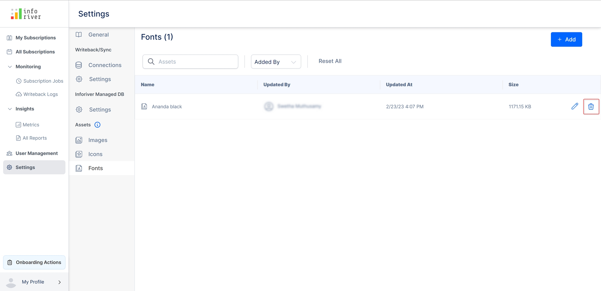 To delete the added font, click the 'Trash' icon of an added font list item.