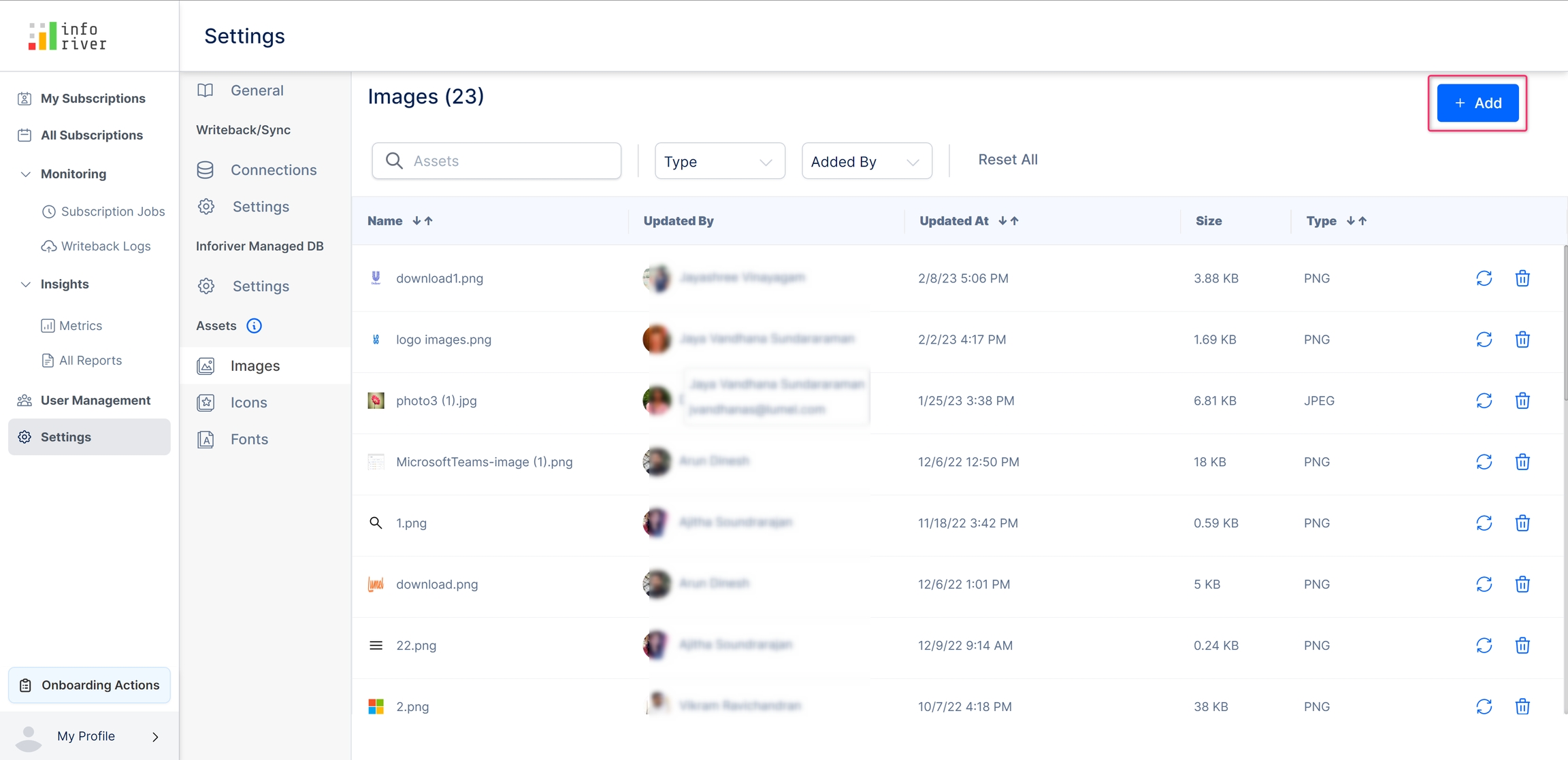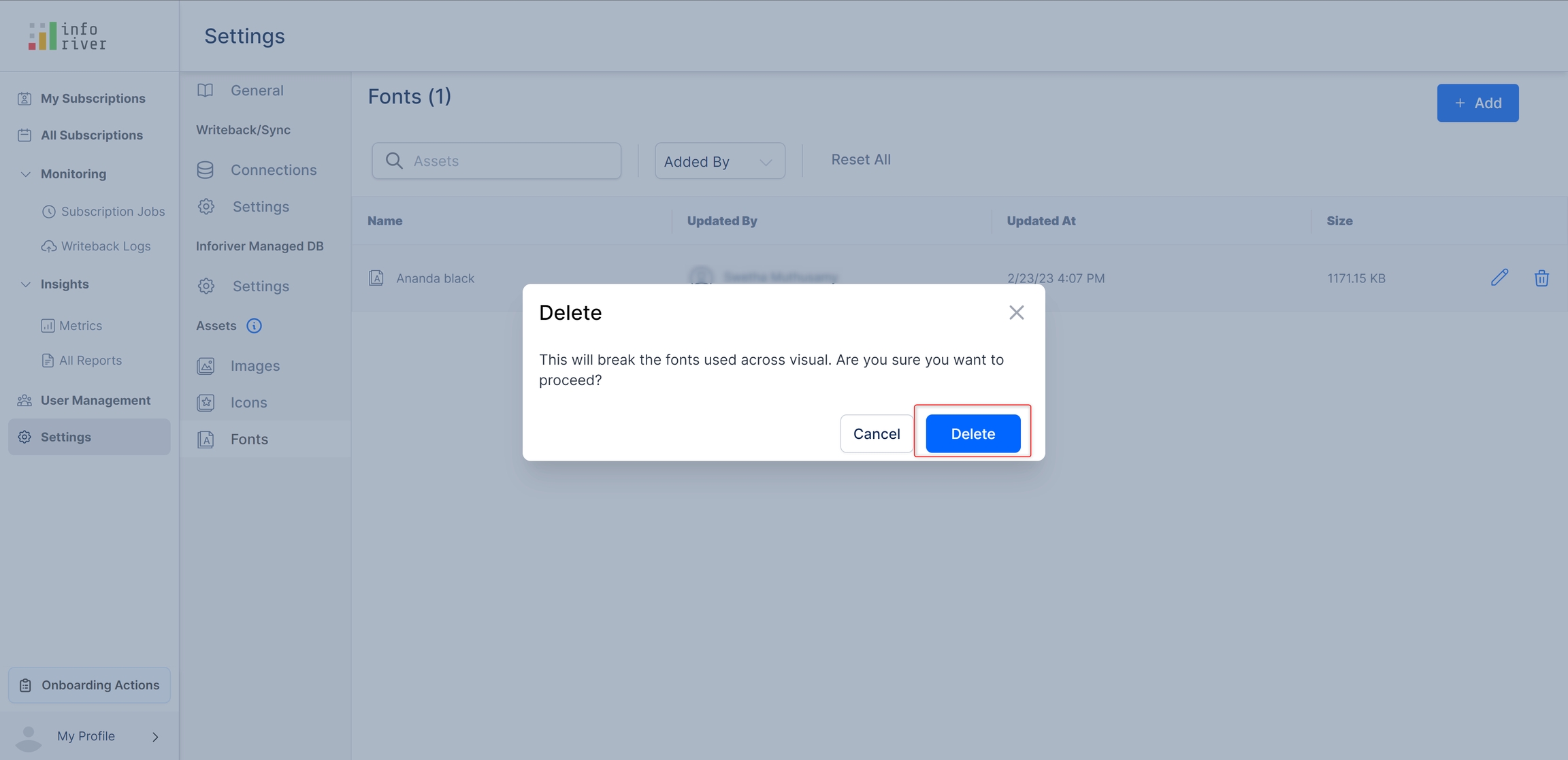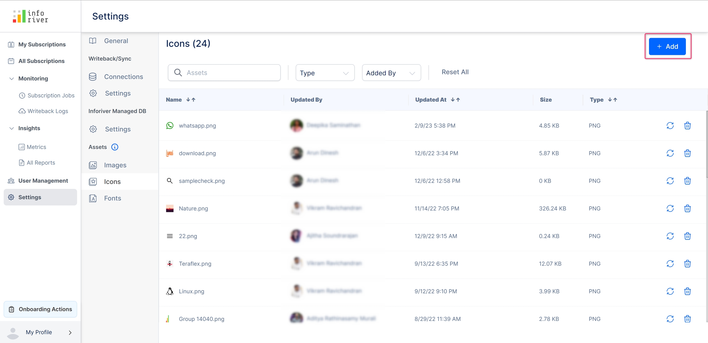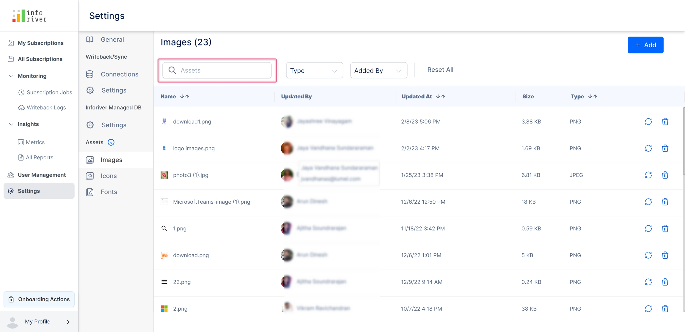 The assets settings make asset management easier by displaying all the assets (images, icons, and fonts) used in the Inforiver visual in a common dashboard. You can easily view, add, update, or delete any asset.