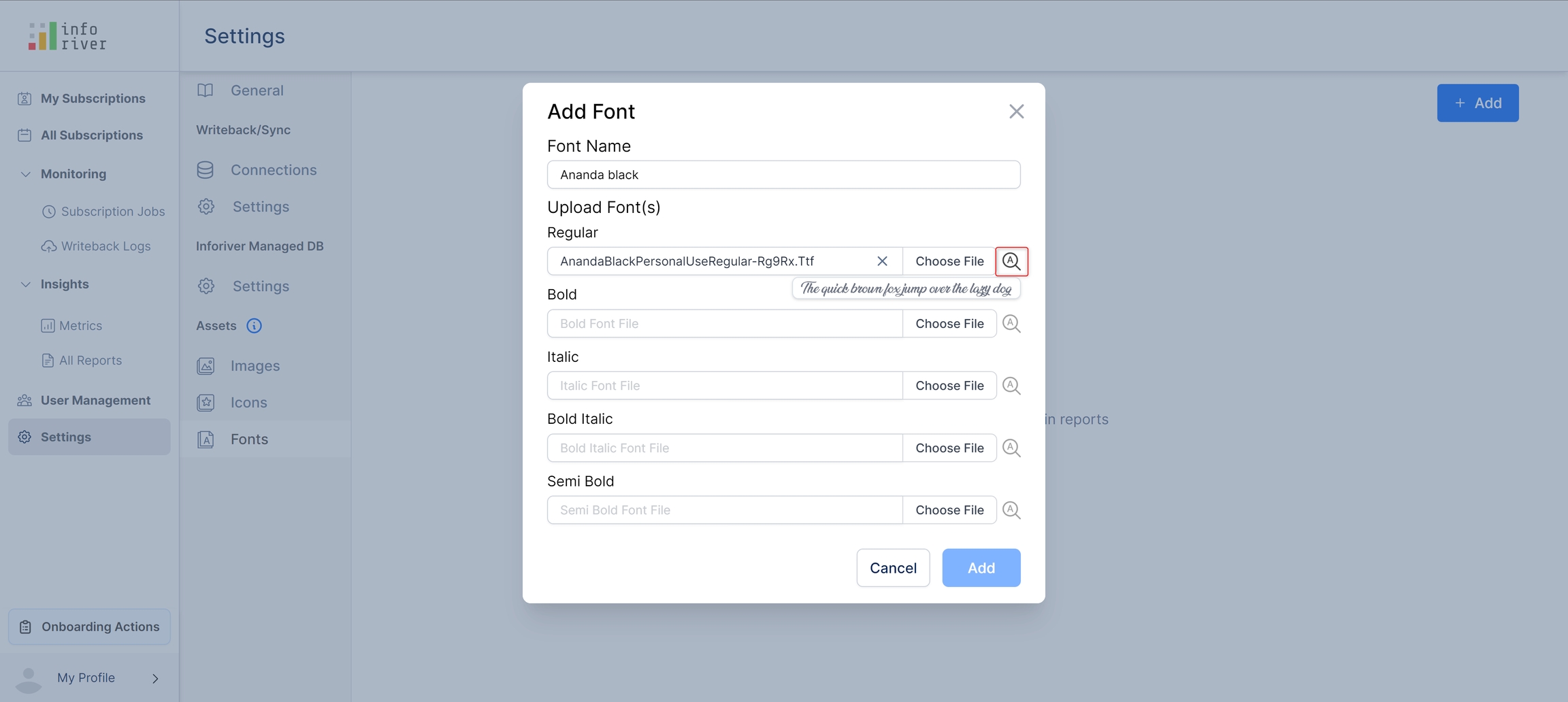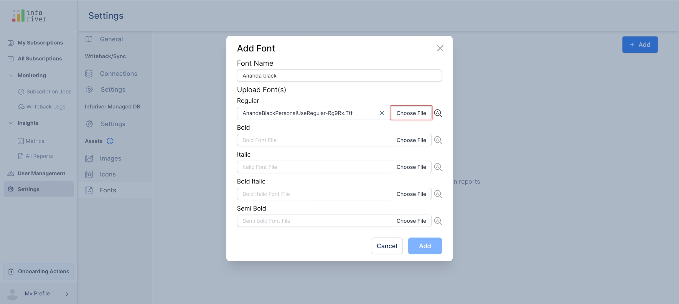 You can add/upload a custom font by clicking on the 'Add' button at the top right corner of the screen.
