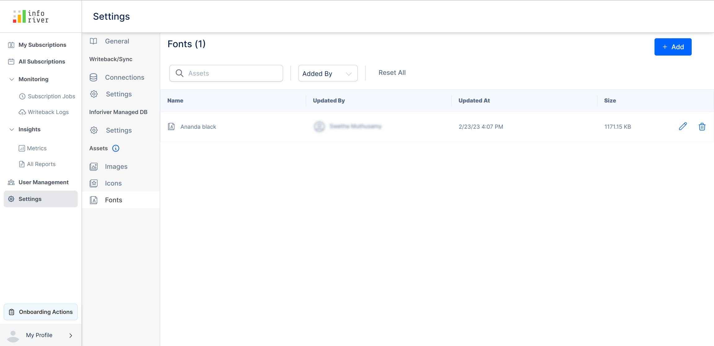 You can edit the uploaded font by clicking on the 'Pencil' icon next to the font list item.