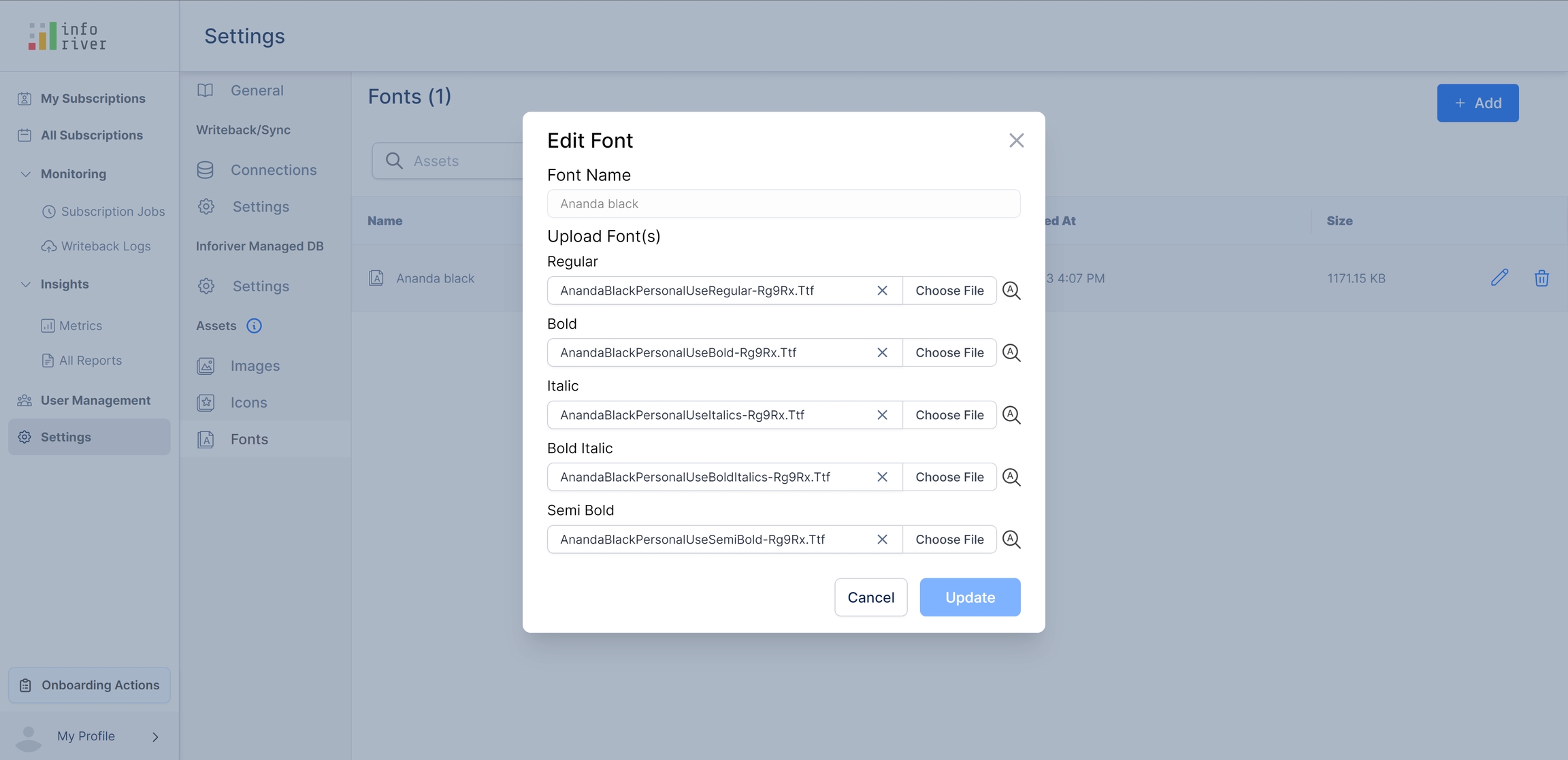This will open up the 'Edit font' modal, in which you make all the necessary edits and click 'Update' to save the changes.